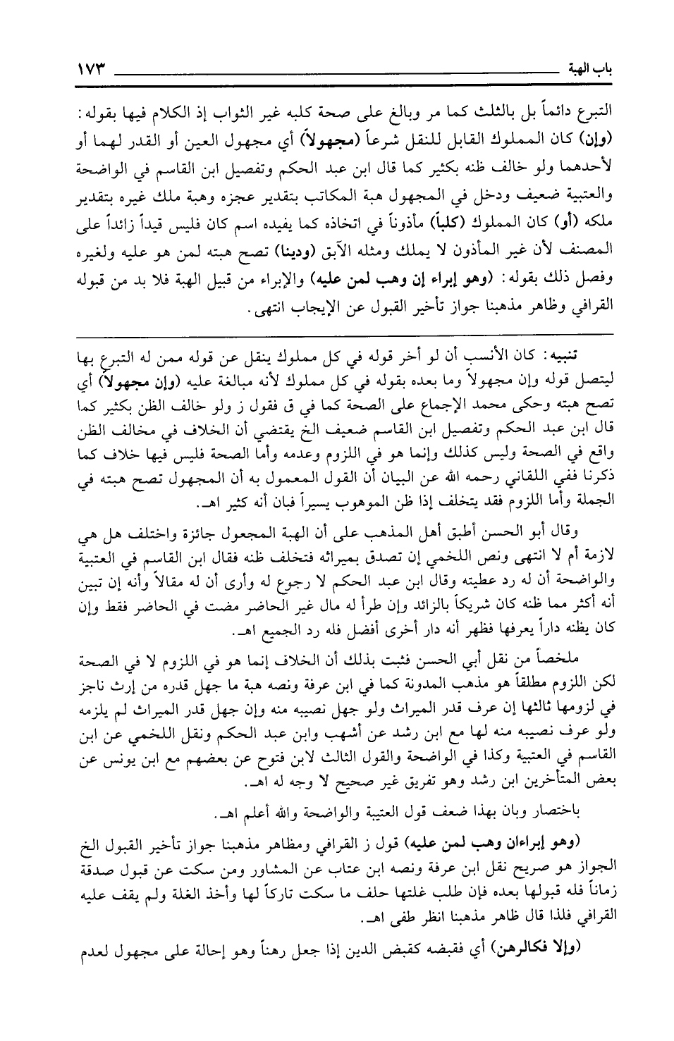 ملخصًا من نقل أبي الحسن فثبت بذلك أن الخلاف إنما هو في اللزوم لا في الصحة لكن اللزوم مطلقًا هو مذهب المدونة كما في ابن عرفة ونصه هبة ما جهل قدره من إرث ناجز في لزومها ثالثها إن عرف قدر الميراث ولو جهل نصيبه منه وإن جهل قدر الميراث لم يلزمه ولو عرف نصيبه منه لها مع ابن رشد عن أشهب وابن عبد الحكم ونقل اللخمي عن ابن القاسم في العتبية وكذا في الواضحة والقول الثالث لابن فتوح عن بعضهم مع ابن يونس عن بعض المتأخرين ابن رشد وهو تفريق غير صحيح لا وجه له اهـ.