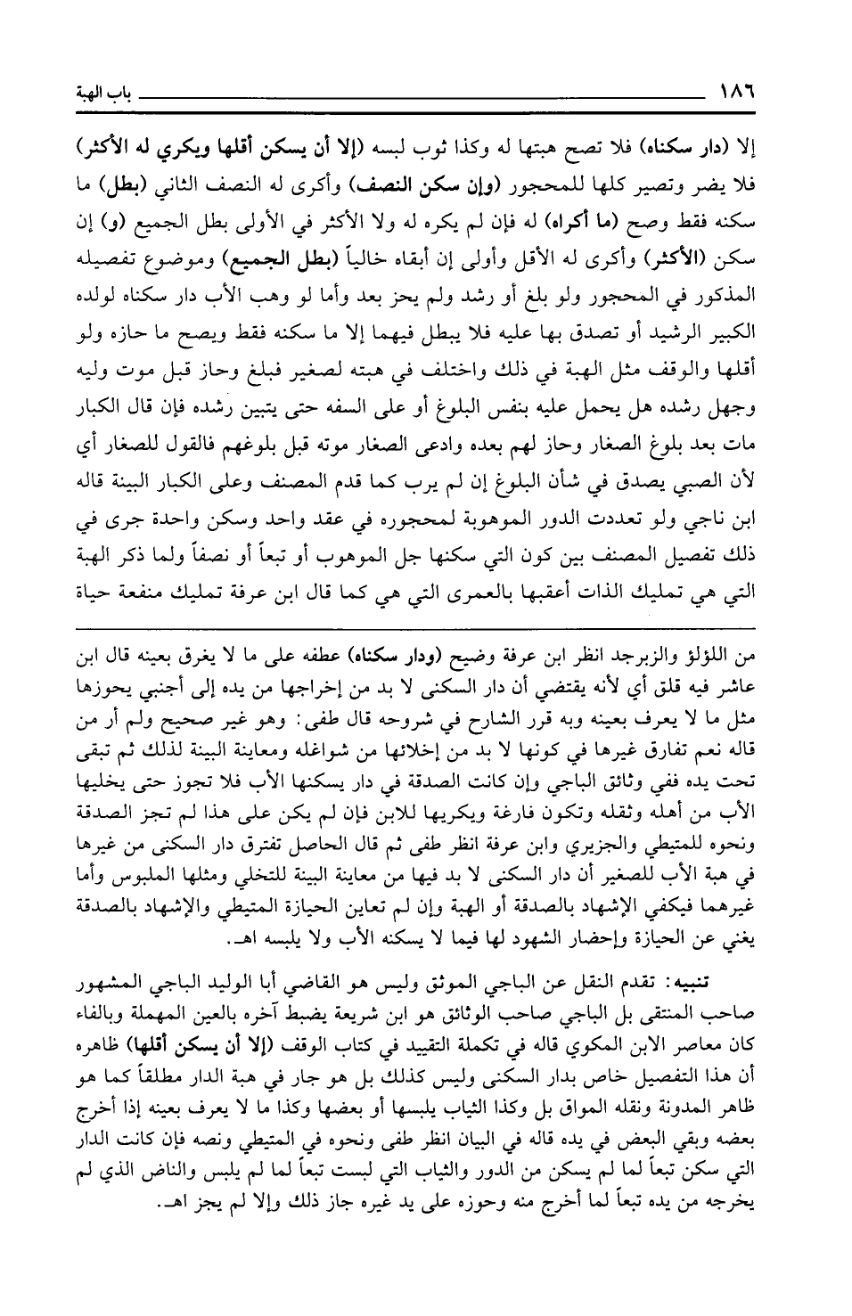تنبيه: تقدم النقل عن الباجي الموثق وليس هو القاضي أبا الوليد الباجي المشهور صاحب المنتقى بل الباجي صاحب الوثائق وابن شريعة يضبط آخره بالعين المهملة وبالفاء كان معاصر الابن المكوي قاله في تكملة التقييد في كتاب الوقف (إلا أن يسكن أقلها) ظاهره أن هذا التفصيل خاص بدار السكنى وليس كذلك بل هو جار في هبة الدار مطلقًا كما هو ظاهر المدونة ونقله المواق بل وكذا الثياب يلبسها أو بعضها وكذا ما لا يعرف بعينه إذا أخرج بعضه وبقي البعض في يده قاله في البيان انظر طفى ونحوه في المتيطي ونصه فإن كانت الدار التي سكن تبعًا لما لم يسكن من الدور والثياب التي لبست تبعًا لما لم يلبس والناض الذي لم يخرجه من يده تبعًا لما أخرج منه وحوزه على يد غيره جاز ذلك وإلا لم يجز اهـ.