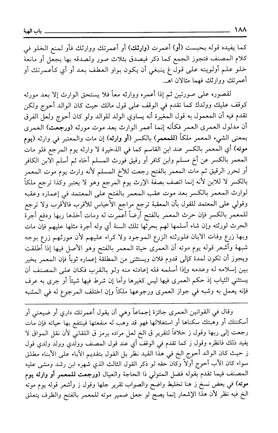 لقصوره على صورتين ثم إذا أعمره ووارثه معًا فلا يستحق الوارث إلا بعد مورثه كوقف عليك وولدك كما تقدم في الوقف على قول مالك حيث كان الوالد أحوج ولكن تقدم فيه أن المعمول به قول المغيرة أنه يساوي الولد للوالد ولو كان أحوج ولعل الفرق أن مدلول العمرى العمر فكأنه إنما أعمر الوارث بعد موت مورثه (ورجعت) العمرى بمعنى الشيء المعمر ملكًا (للمعمر) بالكسر (أو وارثه) إن مات والمعتبر في وارثه (يوم موته) أي المعمر بالكسر عند ابن القاسم كما في الذخيرة لا وارثه يوم المرجع فلو مات المعمر بالكسر عن أخ مسلم وابن كافر أو رقيق فورث المسلم أخاه ثم أسلم الابن الكافر أو تحرر الرقيق ثم مات المعمر بالفتح رجعت للأخ المسلم لأنه وارث يوم موت المعمر بالكسر لا للابن لأنه إنما اتصف بصفة الإرث يوم المرجع وهو لا يعتبر وكذا ترجع ملكًا لوارث المعمر بالكسر بعد موت عقب المعمر بالفتح على المعتمد في إعماره وعقبه وقولي على المعتمد للقول بأن المعقبة ترجع مراجع الأحباس للأقرب فالأقرب ولا ترجع للمعمر بالكسر فإن حرث المعمر بالفتح أرضًا أعمرت له ومات أخذها ربها ودفع أجرة الحرث لورثته وإن شاء أسلمها لهم بحرثها تلك السنة أي وله أجرة مثلها عليهم فإن مات وبها زرع وفات الأبان فلورثته الزرع الموجود ولا كراء عليهم لأن مورثهم زرع بوجه شبهة وأشعر قوله يوم موته أن العمرى حياة المعمر بالفتح وهو الأصل فيها إذا أطلقت ويجوز أن تكون لمدة كإلى قدوم فلان ويستثنى من المطلقة إعماره ثوبًا فإن المعمر يخير بين إسلامه له وعدمه وإذا أسلمه فله إعادته منه ولو بالقرب فكان على المصنف أن يستثني الثياب إذ حكم العمرى فيها ليس كغيرها وأما إن شرط فيها شيئًا أو جرى به عرف فإنه يعمل به وشبه في جواز العمرى ورجوعها ملكًا وإن اختلف المرجوع له في المشبه