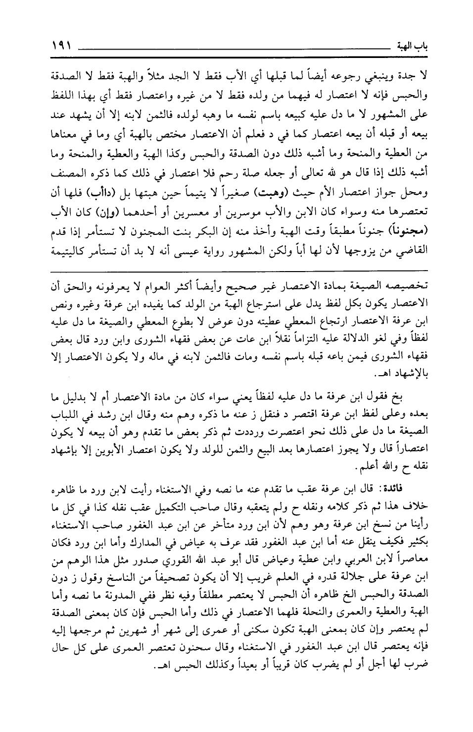تخصيصه الصيغة بمادة الاعتصار غير صحيح وأيضًا أكثر العوام لا يعرفونه والحق أن الاعتصار يكون بكل لفظ يدل على استرجاع الهبة من الولد كما يفيده ابن عرفة وغيره ونص ابن عرفة الاعتصار ارتجاع المعطي عطيته دون عوض لا بطوع المعطي والصيغة ما دل عليه لفظًا وفي لغو الدلالة عليه التزامًا نقلًا ابن عات عن بعض فقهاء الشورى وابن ورد قال بعض فقهاء الشورى فيمن باعه قبله باسم نفسه ومات فالثمن لابنه في ماله ولا يكون الاعتصار إلا بالإشهاد اهـ.