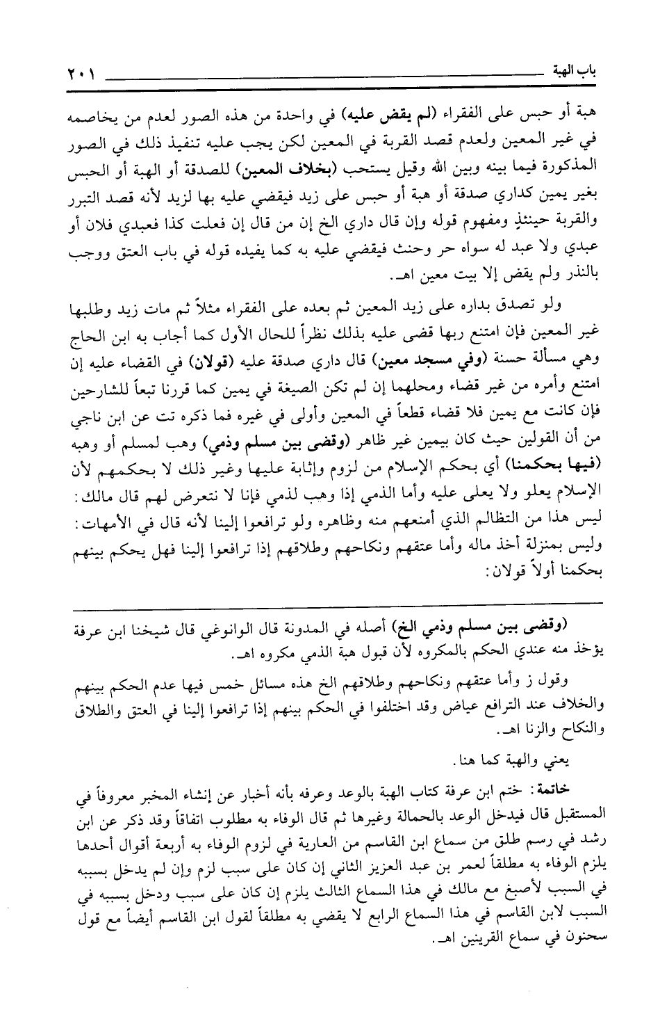 خاتمة: ختم ابن عرفة كتاب الهبة بالوعد وعرفه بأنه أخبار عن إنشاء المخبر معروفًا في المستقبل قال فيدخل الوعد بالحمالة وغيرها ثم قال الوفاء به مطلوب اتفاقًا وقد ذكر عن ابن رشد في رسم طلق من سماع ابن القاسم من العارية في لزوم الوفاء به أربعة أقوال أحدها يلزم الوفاء به مطلقًا لعمر بن عبد العزيز الثاني إن كان على سبب لزم وإن لم يدخل بسببه في السبب لأصبغ مع مالك في هذا السماع الثالث يلزم إن كان على سبب ودخل بسببه في السبب لابن القاسم في هذا السماع الرابع لا يقضي به مطلقًا لقول ابن القاسم أيضًا مع قول سحنون في سماع القرينين اهـ.