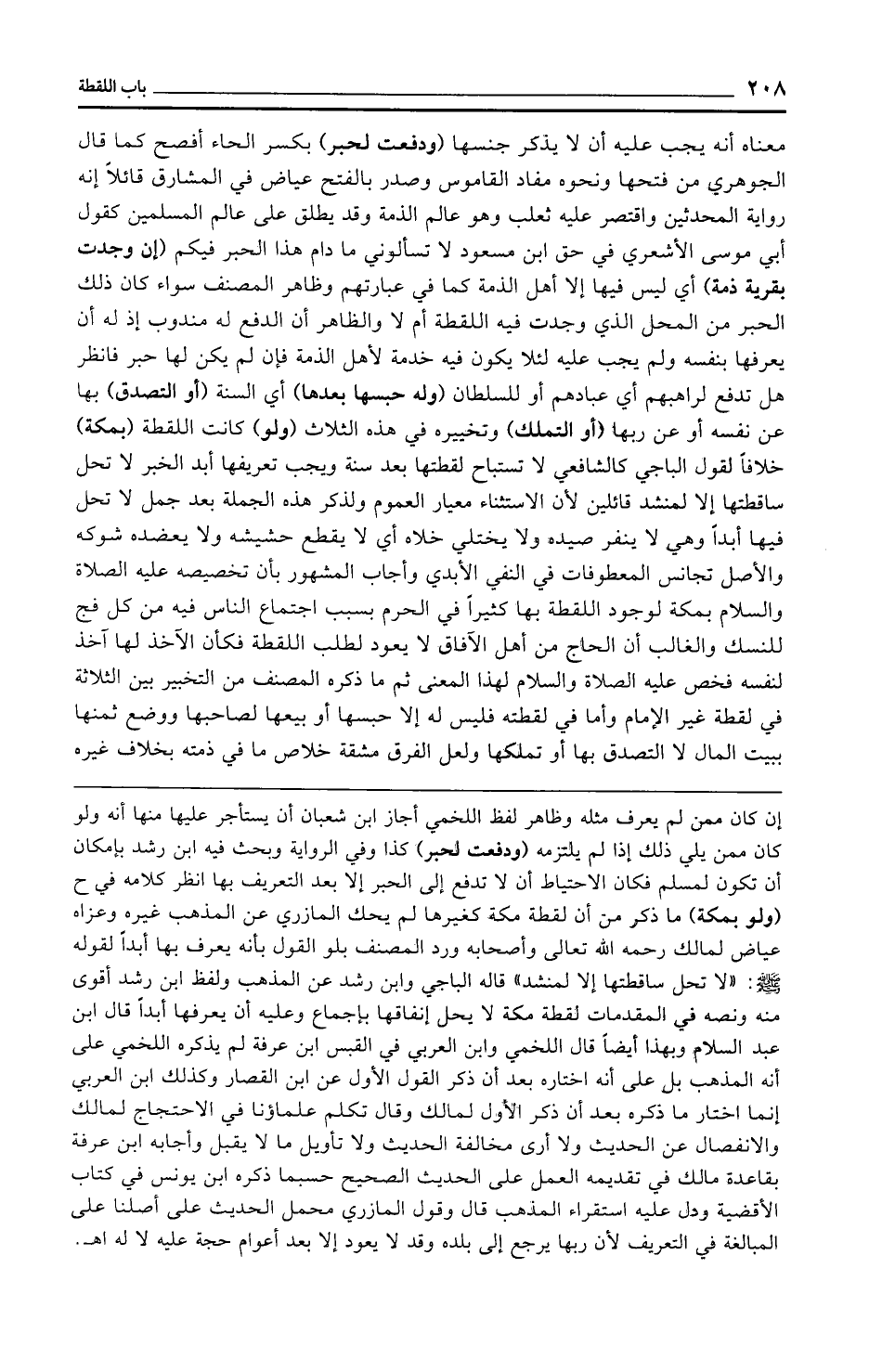 معناه أنه يجب عليه أن لا يذكر جنسها (ودفعت لحبر) بكسر الحاء أفصح كما قال الجوهري من فتحها ونحوه مفاد القاموس وصدر بالفتح عياض في المشارق قائلًا إنه رواية المحدثين واقتصر عليه ثعلب وهو عالم الذمة وقد يطلق على عالم المسلمين كقول أبي موسى الأشعري في حق ابن مسعود لا تسألوني ما دام هذا الحبر فيكم (إن وجدت بقرية ذمة) أي ليس فيها إلا أهل الذمة كما في عبارتهم وظاهر المصنف سواء كان ذلك الحبر من المحل الذي وجدت فيه اللقطة أم لا والظاهر أن الدفع له مندوب إذ له أن يعرفها بنفسه ولم يجب عليه لئلا يكون فيه خدمة لأهل الذمة فإن لم يكن لها حبر فانظر هل تدفع لراهبهم أي عبادهم أو للسلطان (وله حبسها بعدها) أي السنة (أو التصدق) بها عن نفسه أو عن ربها (أو التملك) وتخييره في هذه الثلاث (ولو) كانت اللقطة (بمكة) خلافًا لقول الباجي كالشافعي لا تستباح لقطتها بعد سنة ويجب تعريفها أبد الخبر لا تحل ساقطتها إلا لمنشد قائلين لأن الاستثناء معيار العموم ولذكر هذه الجملة بعد جمل لا تحل فيها أبدًا وهي لا ينفر صيده ولا يختلي خلاه أي لا يقطع حشيشه ولا يعضده شوكه والأصل تجانس المعطوفات في النفي الأبدي وأجاب المشهور بأن تخصيصه عليه الصلاة والسلام بمكة لوجود اللقطة بها كثيرًا في الحرم بسبب اجتماع الناس فيه من كل فج للنسك والغالب أن الحاج من أهل الآفاق لا يعود لطلب اللقطة فكأن الآخذ لها آخذ لنفسه فخص عليه الصلاة والسلام لهذا المعنى ثم ما ذكره المصنف من التخيير بين الثلاثة في لقطة غير الإِمام وأما في لقطته فليس له إلا حبسها أو بيعها لصاحبها ووضع ثمنها ببيت المال لا التصدق بها أو تملكها ولعل الفرق مشقة خلاص ما في ذمته بخلاف غيره