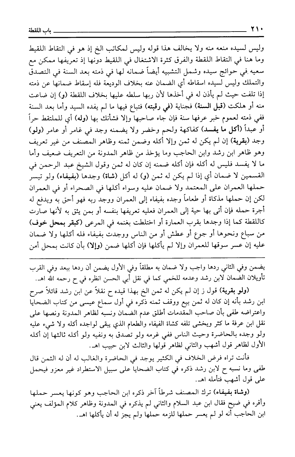 (ولو بقرية) قول ز إن لم يكن له ثمن الخ بهذا قيده ح نقلًا عن ابن رشد قائلًا صرح ابن رشد بأنه إن كان له ثمن بيع ووقف ثمنه ذكره في أول سماع عيسى من كتاب الضحايا واعتراضه طفى بأن صاحب المقدمات أطلق عدم الضمان ونسبه لظاهر المدونة ونصها على نقل ابن عرفة ما أكثر ويخشى تلفه كشاة الفيفاء والطعام الذي يبقى لواجده أكله ولا شيء عليه ولو وجده بالحاضرة وحيث الناس ففي غرمه ولو تصدق به ونفيه ولو أكله ثالثها إن أكله الأول لظاهر قول أشهب والثاني لظاهر قولها والثالث لابن حبيب اهـ.