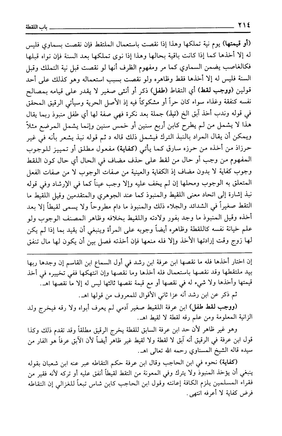 (أو قيمتها) يوم نية تملكها وهذا إذا نقصت باستعمال الملتقط فإن نقصت بسماوي فليس له إلا أخذها كما إذا كانت باقية بحالها وهذا إذا نوى تملكها بعد السنة فإن نواه قبلها فكالغاصب يضمن السماوي كما مر ومفهوم الظرف أنها لو نقصت قبل نية التملك وقبل السنة فليس له إلا أخذها فقط وظاهره ولو نقصت بسبب استعماله وهو كذلك على أحد قولين (ووجب لقط) أي التقاط (طفل) ذكر أو أنثى صغير لا يقدر على قيامه بمصالح نفسه كنفقة وغذاء سواء كان حرًّا أو مشكوكًا فيه إذ الأصل الحرية وسيأتي الرقيق المحقق في قوله وندب أخذ آبق الخ (نبذ) جملة بعد نكرة فهي صفة لها أي طفل منبوذ ربما يقال هذا لا يشمل من لم يطرح كابن أربع سنين أو خمس سنين وإنما يشمل المرضع مثلًا ويمكن أن يقال المراد بالنبذ الترك فيشمل ذلك قاله د ثم قوله نبذ يشعر بأنه في غير حرزاذ من أخذه من حرزه سارق كما يأتي (كفاية) مفعول مطلق أو تمييز للوجوب المفهوم من وجب أو حال من لقط على حذف مضاف في الحال أي حال كون اللقط وجوب كفاية لا بدون مضاف إذ الكفاية والعينية من صفات الوجوب لا من صفات الفعل المتعلق به الوجوب ومحلها إن لم يخف عليه وإلا وجب عينًا كما في الإرشاد وفي قوله نبذ إشارة إلى اتحاد معنى اللقيط والمنبوذ كما عند الجوهري والمتقدمين وقيل اللقيط ما التقط صغيرًا في الشدائد والجلاء ذلك والمنبوذ ما دام مطروحًا ولا يسمى لقيطًا إلا بعد أخذه وقيل المنبوذ ما وجد بفور ولادته واللقيط بخلافه وظاهر المصنف الوجوب ولو علم خيانة نفسه كاللقطة وظاهره أيضًا وجوبه على المرأة وينبغي أن يقيد بما إذا لم يكن لها زوج وقت إرادتها الأخذ وإلا فله منعها فإن أخذته فصل بين أن يكون لها مال تنفق
