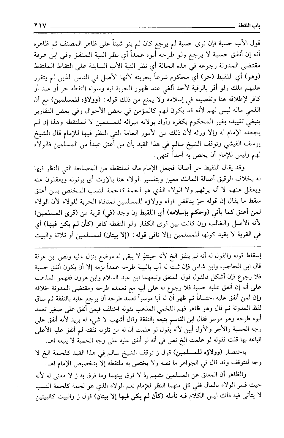 قول الأب حسبة فإن نوى حسبة لم يرجع كان لم ينو شيئًا على ظاهر المصنف ثم ظاهره أنه إن أنفق حسبة لا يرجع ولو طرحه أبوه عمدًا أي نظر النية المنفق وفي ابن عرفة مقتضى المدونة رجوعه في هذه الحالة أي نظر النية الأب السابقة على التقاط الملتقط (وهو) أي اللقيط (حر) أي محكوم شرعًا بحريته لأنها الأصل في الناس الذين لم يتقرر عليهم ملك ولو أقر بالرقية لأحد ألغي عند ظهور الحرية فيه وسواء التقطه حر أو عبد أو كافر لإطلاقه هنا وتفصيله في إسلامه ولا يمنع من ذلك قوله: (وولاؤه للمسلمين) مع أن الذمي ماله ليس لهم لأنه قد يكون لهم كالمؤمن في بعض الأحوال وفي بعض التقارير ينبغي تقييده بغير المحكوم بكفره وأراد بولائه ميراثه للمسلمين لا لملتقطه وهذا إن لم يجعله الإِمام له وإلا ورثه لأن ذلك من الأمور العامة التي النظر فيها للإمام قال الشيخ يوسف الفيشي وتوقف الشيخ سالم في هذا القيد بأن من أعتق عبدًا من المسلمين فالولاء لهم وليس للإمام أن يخص به أحدًا انتهى.