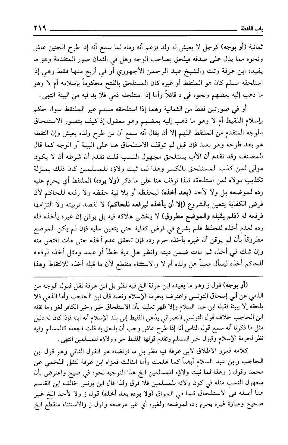 ثمانية (أو بوجه) كرجل لا يعيش له ولد فزعم أنه رماه لما سمع أنه إذا طرح الجنين عاش ونحوه مما يدل على صدقه فيلحق بصاحب الوجه وهل في الثمان صور المتقدمة وهو ما يفيده ابن عرفة وتت والشيخ عبد الرحمن الأجهوري أو في أربع منها فقط وهي إذا استلحقه مسلم كان هو الملتقط أو غيره كان المستلحق بالفتح محكومًا بإسلامه أم لا وهو ما ذهب إليه بعضهم ونحوه في د قائلًا وأما إذا استلحقه ذمي فلا بد فيه من البينة انتهى.