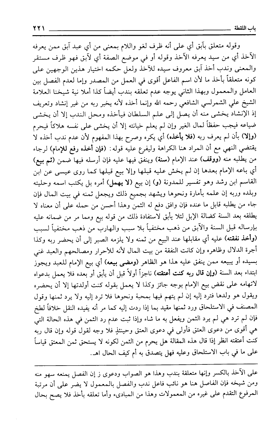 وقوله متعلق بآبق أي على أنه ظرف لغو واللام بمعنى من أي عبد آبق ممن يعرفه الآخذ أي من سيد يعرفه الآخذ وقوله أو في موضع الصفة أي لآبق فهو ظرف مستقر والمعنى وندب أخذ آبق معروف سيده للآخذ ولعل حكمه اختيار هذين الوجهين على كونه متعلقًا بأخذ ما لأن اسم الفاعل أقوى في العمل من المصدر وإما لعدم الفصل بين العامل والمعمول وبهذا الثاني يوجه عدم تعلقه بندب أيضًا كذا أملا نية شيخنا العلامة الشيخ علي الشمرلسي الشافعي رحمه الله وإنما أخذه لأنه يخبر ربه من غير إنشاد وتعريف إذ الإسناد يخشى منه أن يصل إلى علم السلطان فيأخذه ومحل الندب إلا أن يخشى ضياعه فيجب حفظًا لمال الغير وإن لم يعلم خيانته إلا أن يخشى على نفسه هلاكًا فيحرم (وإلا) بأن لم يعرف ربه (فلا يأخذه) أي يكره وصرح بهذا المفهوم لأن عدم ندب أخذه لا يقتضي النهي مع أن المراد هنا الكراهة وليفرع عليه قوله: (فإن أخذه رفع للإمام) لرجاء من يطلبه منه (ووقف) عند الإمام (سنة) وينفق فيها عليه فإن أرسله فيها ضمن (ثم بيع) أي باعه الإِمام بعدها إن لم يخش عليه قبلها وإلا بيع قبلها كما روى عيسى عن ابن القاسم ابن رشد وهو تفسير للمدونة (و) إن بيع (لا يهمل) أمره بل يكتب اسمه وحليته وبلده وربه إن علمه بأمارة ونحوها ويشهد بجميع ذلك ويجعل ثمنه في بيت المال فإن جاء من يطلبه قابل ما عنده فإن وافق دفع له الثمن وهذا أحسن من حمله على أن معناه لا يطلقه بعد السنة كضالة الإبل لئلا يأبق لاستفادة ذلك من قوله بيع ومما مر من ضمانه عليه بإرساله قبل السنة والآبق من ذهب مختفيًا بلا سبب والهارب من ذهب مختفيًا لسبب (وأخذ نفقته) عليه أي مقابلها عند البيع من ثمنه ولا يلزمه الصبر إلى أن يحضر ربه وكذا أجرة الدلال وظاهره وإن كانت النفقة من بيت المال لأنه للأحرار ومصالحهم والعبد غني بسيده أو يبيعه ممن ينفق عليه هذا هو الظاهر (ومضى بيعه) أي بيع الإمام للعبد ويجوز ابتداء بعد السنة (وإن قال ربه كنت أعتقته) ناجزًا أولًا قبل أن يأبق أو بعده فلا يعمل بدعواه لاتهامه على نقض بيع الإمام بوجه جائز وكذا لا يعمل بقوله كنت أولدتها إلا أن يحضره ويقول هو ولدها فترد إليه إن لم يتهم فيها بمحبة ونحوها فلا ترد إليه ولا يرد ثمنها وقول المصنف في الاستلحاق ورد ثمنها مقيد بما إذا ردت إليه كما مر أنه يفيده النقل خلافًا لطخ فإن لم ترد هي لم يرد الثمن ويفعل به ما شاء وإذا ثبت عدم رد الثمن في هذه الحالة التي هي أقوى من دعوى العتق فأولى في دعوى العتق وحينئذٍ فلا وجه لقول قوله وإن قال ربه كنت أعتقته انظر إذا قال هذه المقالة هل يحرم من الثمن لكونه لا يستحق ثمن المعتق قياسًا على ما في باب الاستلحاق وعليه فهل يتصدق به أم كيف الحال اهـ.