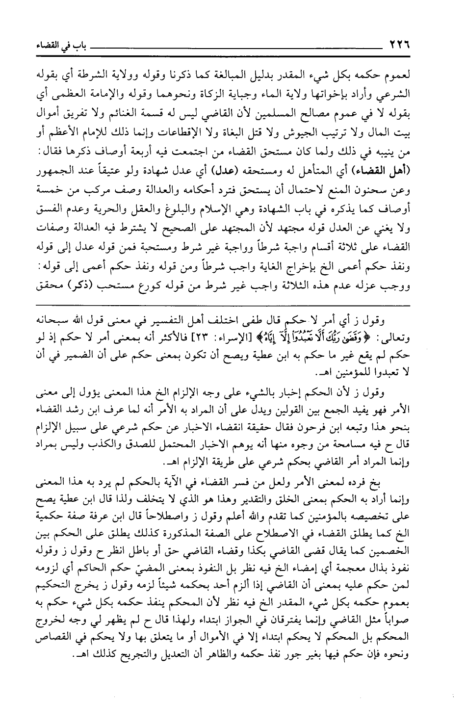 بخ فرده لمعنى الأمر ولعل من فسر القضاء في الآية بالحكم لم يرد به هذا المعنى وإنما أراد به الحكم بمعنى الخلق والتقدير وهذا هو الذي لا يتخلف ولذا قال ابن عطية يصح على تخصيصه بالمؤمنين كما تقدم والله أعلم وقول ز واصطلاحًا قال ابن عرفة صفة حكمية الخ كما يطلق القضاء في الاصطلاح على الصفة المذكورة كذلك يطلق على الحكم بين الخصمين كما يقال قضى القاضي بكذا وقضاء القاضي حق أو باطل انظر ح وقول ز وقوله نفوذ بذال معجمة أي إمضاء الخ فيه نظر بل النفوذ بمعنى المضيّ حكم الحاكم أي لزومه لمن حكم عليه بمعنى أن القاضي إذا ألزم أحد بحكمه شيئًا لزمه وقول ز يخرج التحكيم بعموم حكمه بكل شيء المقدر الخ فيه نظر لأن المحكم ينفذ حكمه بكل شيء حكم به صوابًا مثل القاضي وإنما يفترقان في الجواز ابتداء ولهذا قال ح لم يظهر لي وجه لخروج المحكم بل المحكم لا يحكم ابتداء إلا في الأموال أو ما يتعلق بها ولا يحكم في القصاص ونحوه فإن حكم فيها بغير جور نفذ حكمه والظاهر أن التعديل والتجريح كذلك اهـ.