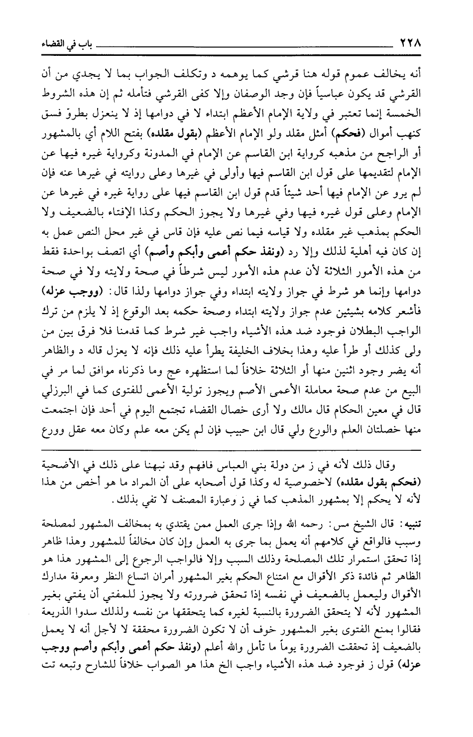 تنبيه: قال الشيخ مس: رحمه الله وإذا جرى العمل ممن يقتدي به بمخالف المشهور لمصلحة وسبب فالواقع في كلامهم أنه يعمل بما جرى به العمل وإن كان مخالفًا للمشهور وهذا ظاهر إذا تحقق استمرار تلك المصلحة وذلك السبب وإلا فالواجب الرجوع إلى المشهور هذا هو الظاهر ثم فائدة ذكر الأقوال مع امتناع الحكم بغير المشهور أمر أن اتساع النظر ومعرفة مدارك الأقوال وليعمل بالضعيف في نفسه إذا تحقق ضرورته ولا يجوز للمفتي أن يفتي بغير المشهور لأنه لا يتحقق الضرورة بالنبة لغيره كما يتحققها من نفسه ولذلك سدوا الذريعة فقالوا بمنع الفتوى بغير المشهور خوف أن لا تكون الضرورة محققة لا لأجل أنه لا يعمل بالضعيف إذ تحققت الضرورة يومًا ما تأمل والله أعلم (ونفذ حكم أعمى وأبكم وأصم ووجب عزله) قول ز فوجود ضد هذه الأشياء واجب الخ هذا هو الصواب خلافًا للشارح وتبعه تت