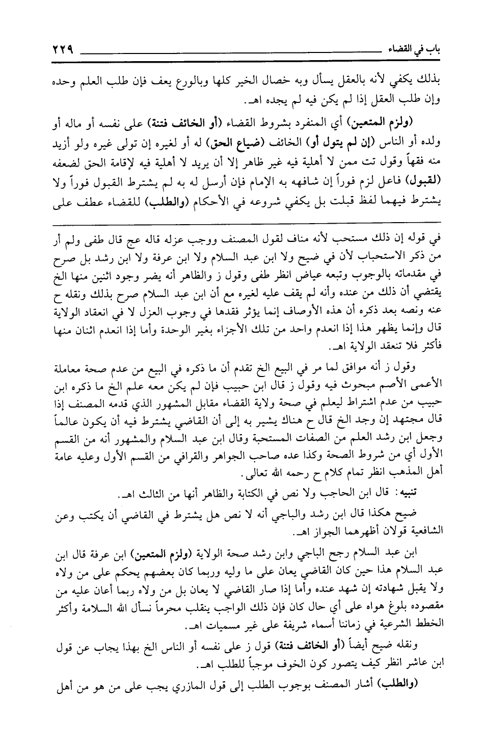 ابن عبد السلام رجح الباجي وابن رشد صحة الولاية (ولزم المتعين) ابن عرفة قال ابن عبد السلام هذا حين كان القاضي يعان على ما وليه وربما كان بعضهم يحكم على من ولاه ولا يقبل شهادته إن شهد عنده وأما إذا صار القاضي لا يعان بل من ولاه ربما أعان عليه من مقصوده بلوغ هواه على أي حال كان فإن ذلك الواجب ينقلب محرمًا نسأل الله السلامة وأكثر الخطط الشرعية في زماننا أسماء شريفة على غير مسميات اهـ.