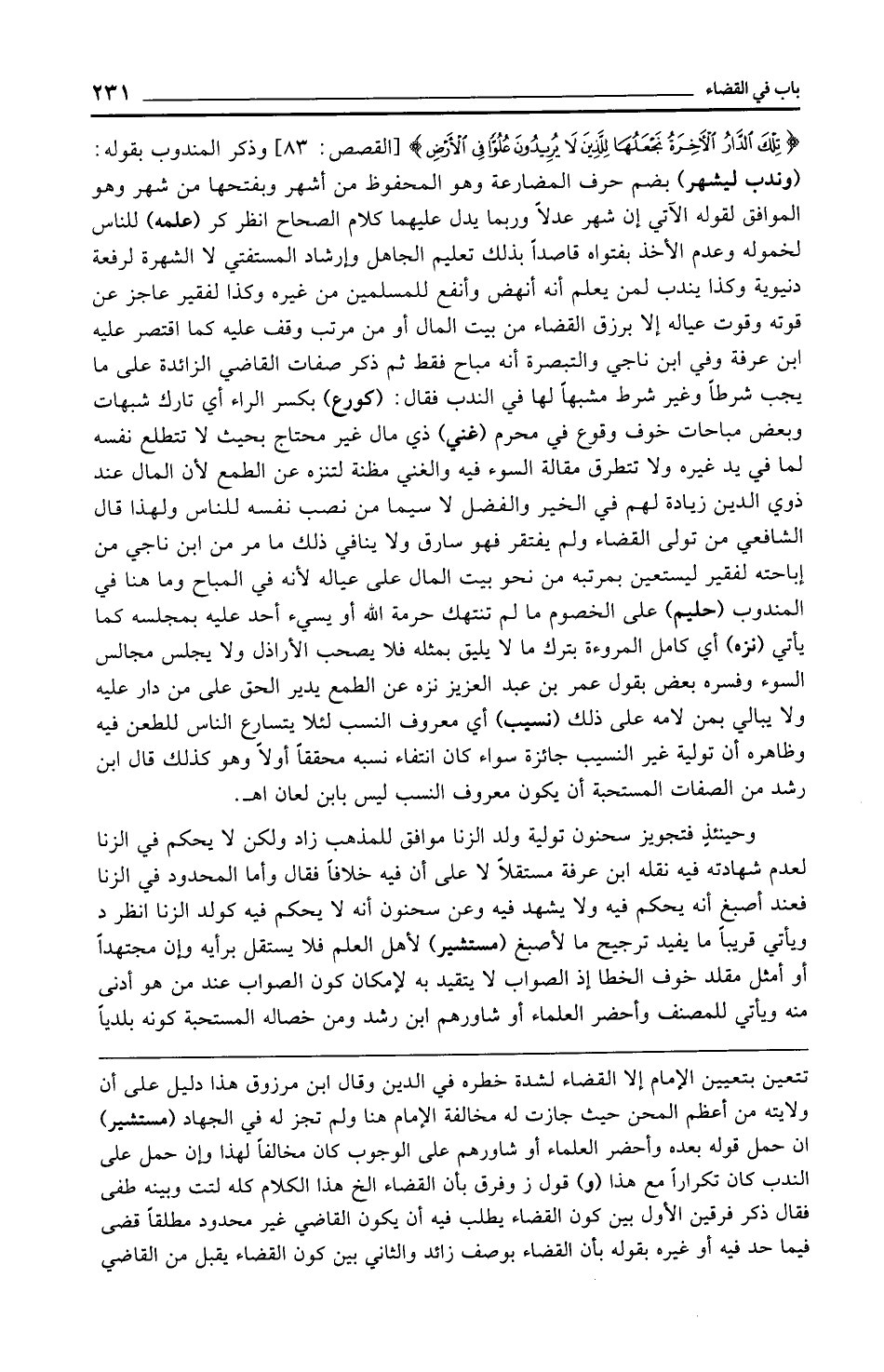 {تِلْكَ الدَّارُ الْآخِرَةُ نَجْعَلُهَا لِلَّذِينَ لَا يُرِيدُونَ عُلُوًّا فِي الْأَرْضِ} [القصص: 83] وذكر المندوب بقوله: (وندب ليشهر) بضم حرف المضارعة وهو المحفوظ من أشهر وبفتحها من شهر وهو الموافق لقوله الآتي إن شهر عدلًا وربما يدل عليهما كلام الصحاح انظر كر (علمه) للناس لخموله وعدم الأخذ بفتواه قاصدًا بذلك تعليم الجاهل وإرشاد المستفتي لا الشهرة لرفعة دنيوية وكذا يندب لمن يعلم أنه أنهض وأنفع للمسلمين من غيره وكذا لفقير عاجز عن قوته وقوت عياله إلا برزق القضاء من بيت المال أو من مرتب وقف عليه كما اقتصر عليه ابن عرفة وفي ابن ناجي والتبصرة أنه مباح فقط ثم ذكر صفات القاضي الزائدة على ما يجب شرطًا وغير شرط مشبهًا لها في الندب فقال: (كورع) بكسر الراء أي تارك شبهات وبعض مباحات خوف وقوع في محرم (غني) ذي مال غير محتاج بحيث لا تتطلع نفسه لما في يد غيره ولا تتطرق مقالة السوء فيه والغني مظنة لتنزه عن الطمع لأن المال عند ذوي الدين زيادة لهم في الخير والفضل لا سيما من نصب نفسه للناس ولهذا قال الشافعي من تولى القضاء ولم يفتقر فهو سارق ولا ينافي ذلك ما مر من ابن ناجي من إباحته لفقير ليستعين بمرتبه من نحو بيت المال على عياله لأنه في المباح وما هنا في المندوب (حليم) على الخصوم ما لم تنتهك حرمة الله أو يسيء أحد عليه بمجلسه كما يأتي (نزه) أي كامل المروءة بترك ما لا يليق بمثله فلا يصحب الأراذل ولا يجلس مجالس السوء وفسره بعض بقول عمر بن عبد العزيز نزه عن الطمع يدير الحق على من دار عليه ولا يبالي بمن لامه على ذلك (نسيب) أي معروف النسب لئلا يتسارع الناس للطعن فيه وظاهره أن تولية غير النسيب جائزة سواء كان انتفاء نسبه محققًا أولًا وهو كذلك قال ابن رشد من الصفات المستحبة أن يكون معروف النسب ليس بابن لعان اهـ.