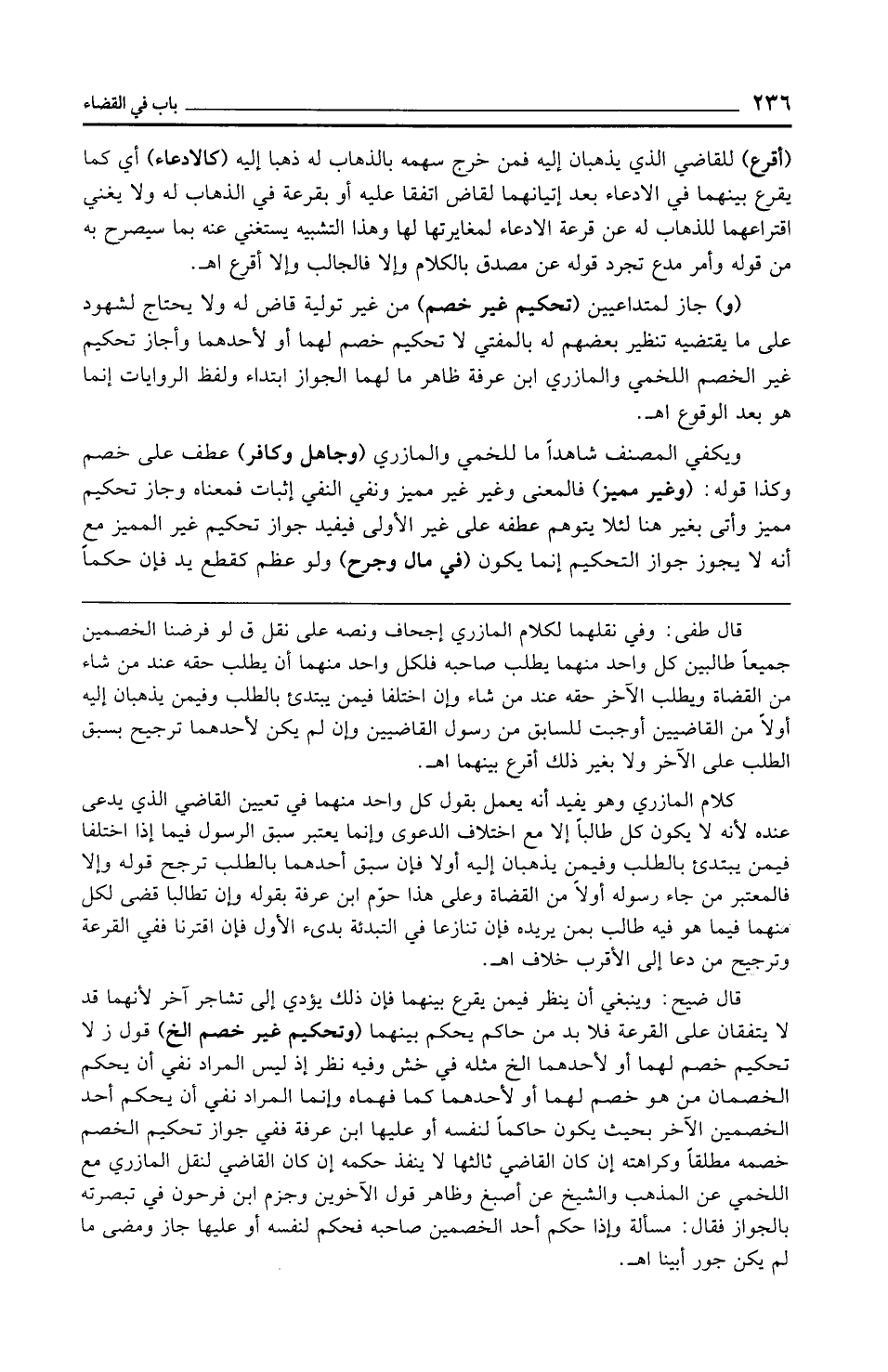 قال طفى: وفي نقلهما لكلام المازري إجحاف ونصه على نقل ق لو فرضنا الخصمين جميعًا طالبين كل واحد منهما يطلب صاحبه فلكل واحد منهما أن يطلب حقه عند من شاء من القضاة ويطلب الآخر حقه عند من شاء وإن اختلفا فيمن يبتدئ بالطلب وفيمن يذهبان إليه أولًا من القاضيين أوجبت للسابق من رسول القاضيين وإن لم يكن لأحدهما ترجيح بسبق الطلب على الآخر ولا بغير ذلك أقرع بينهما اهـ.