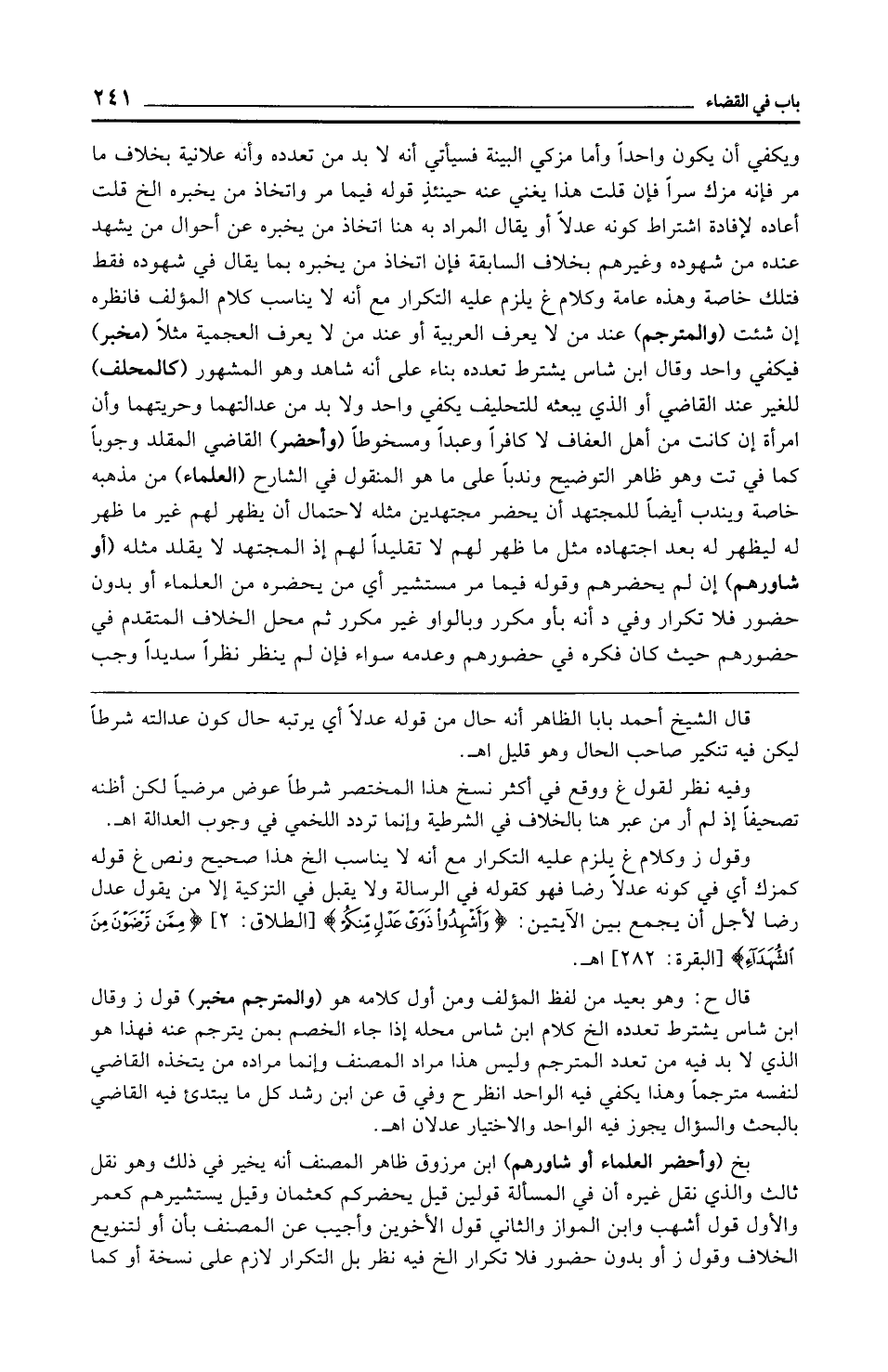 وفيه نظر لقول غ ووقع في أكثر نسخ هذا المختصر شرطًا عوض مرضيًّا لكن أظنه تصحيفًا إذ لم أر من عبر هنا بالخلاف في الشرطية وإنما تردد اللخمي في وجوب العدالة اهـ.