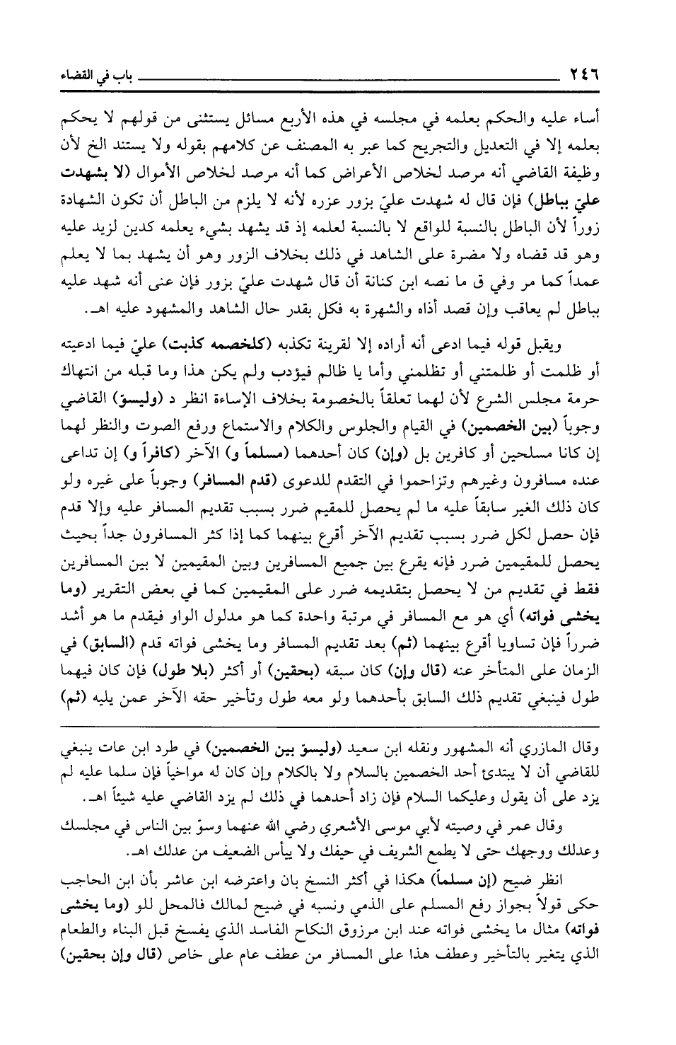 ويقبل قوله فيما ادعى أنه أراده إلا لقرينة تكذبه (كلخصمه كذبت) عليّ فيما ادعيته أو ظلمت أو ظلمتني أو تظلمني وأما يا ظالم فيؤدب ولم يكن هذا وما قبله من انتهاك حرمة مجلس الشرع لأن لهما تعلقًا بالخصومة بخلاف الإساءة انظر د (وليسوّ) القاضي وجوبًا (بين الخصمين) في القيام والجلوس والكلام والاستماع ورفع الصوت والنظر لهما إن كانا مسلحين أو كافرين بل (وإن) كان أحدهما (مسلمًا و) الآخر (كافرًا و) إن تداعى عنده مسافرون وغيرهم وتزاحموا في التقدم للدعوى (قدم المسافر) وجوبًا على غيره ولو كان ذلك الغير سابقًا عليه ما لم يحصل للمقيم ضرر بسبب تقديم المسافر عليه وإلا قدم فإن حصل لكل ضرر بسبب تقديم الآخر أقرع بينهما كما إذا أكثر المسافرون جدًّا بحيث يحصل للمقيمين ضرر فإنه يقرع بين جميع المسافرين وبين المقيمين لا بين المسافرين فقط في تقديم من لا يحصل بتقديمه ضرر على المقيمين كما في بعض التقرير (وما يخشى فواته) أي هو مع المسافر في مرتبة واحدة كما هو مدلول الواو فيقدم ما هو أشد ضررًا فإن تساويا أقرع بينهما (ثم) بعد تقديم المسافر وما يخشى فواته قدم (السابق) في الزمان على المتأخر عنه (قال وإن) كان سبقه (بحقين) أو أكثر (بلا طول) فإن كان فيهما طول فينبغي تقديم ذلك السابق بأحدهما ولو معه طول وتأخير حقه الآخر عمن يليه (ثم)