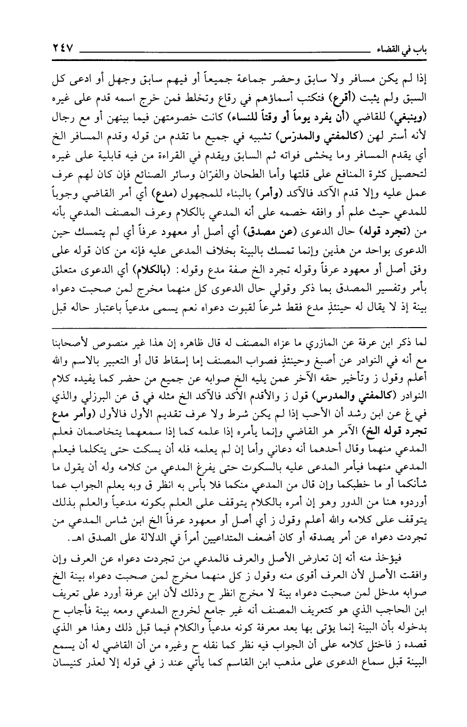 لما ذكر ابن عرفة عن المازري ما عزاه المصنف له قال ظاهره إن هذا غير منصوص لأصحابنا مع أنه في النوادر عن أصبغ وحينئذٍ فصواب المصنف إما إسقاط قال أو التعبير بالاسم والله أعلم وقول ز وتأخير حقه الآخر عمن يليه الخ صوابه عن جميع من حضر كما يفيده كلام النوادر (كالمفتي والمدرس) قول ز والأقدم الأكد فالآكد الخ مثله في ق عن البرزلي والذي في غ عن ابن رشد أن الأحب إذا لم يكن شرط ولا عرف تقديم الأول فالأول (وأمر مدع تجرد قوله الخ) الآمر هو القاضي وإنما يأمره إذا علمه كما إذا سمعهما يتخاصمان فعلم المدعي منهما وقال أحدهما أنه دعاني وأما إن لم يعلمه فله أن يسكت حتى يتكلما فيعلم المدعي منهما فيأمر المدعى عليه بالسكوت حتى يفرغ المدعي من كلامه وله أن يقول ما شأنكما أو ما خطبكما وإن قال من المدعي منكما فلا بأس به انظر ق وبه يعلم الجواب عما أوردوه هنا من الدور وهو إن أمره بالكلام يتوقف على العلم بكونه مدعيًا والعلم بذلك يتوقف على كلامه والله أعلم وقول ز أي أصل أو معهود عرفًا الخ ابن شاس المدعي من تجردت دعواه عن أمر يصدقه أو كان أضعف المتداعيين أمرًا في الدلالة على الصدق اهـ.