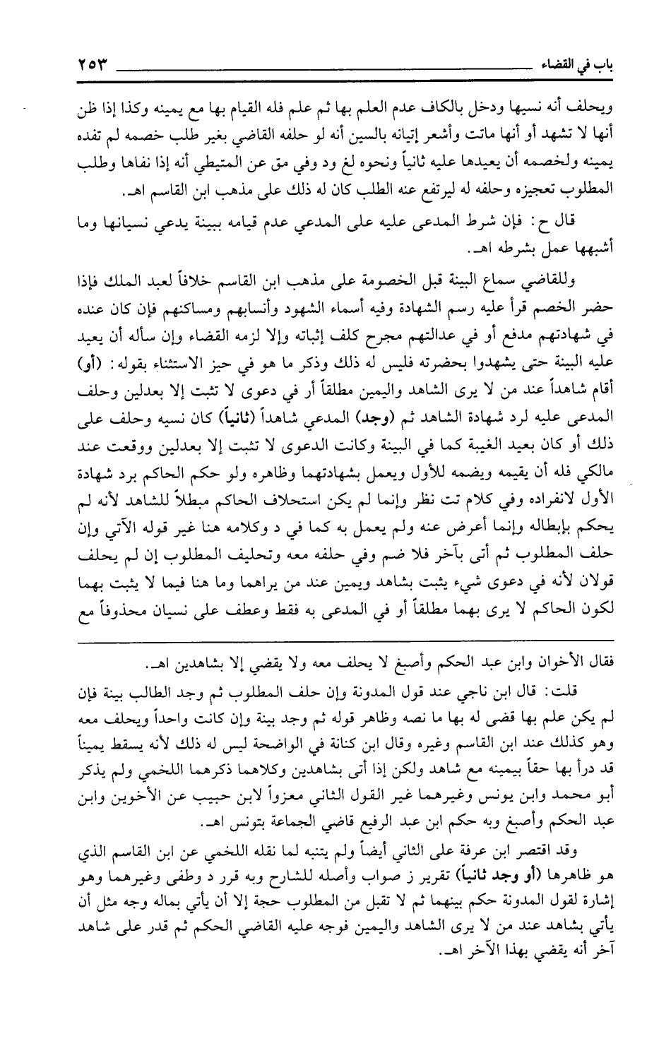 قلت: قال ابن ناجي عند قول المدونة وإن حلف المطلوب ثم وجد الطالب بينة فإن لم يكن علم بها قضى له بها ما نصه وظاهر قوله ثم وجد بينة وإن كانت واحدًا ويحلف معه وهو كذلك عند ابن القاسم وغيره وقال ابن كنانة في الواضحة ليس له ذلك لأنه يسقط يمينًا قد درأ بها حقًّا بيمينه مع شاهد ولكن إذا أتى بشاهدين وكلاهما ذكرهما اللخمي ولم يذكر أبو محمَّد وابن يونس وغيرهما غير القول الثاني معزوًا لابن حبيب عن الأخوين وابن عبد الحكم وأصبغ وبه حكم ابن عبد الرفيع قاضي الجماعة بتونس اهـ.