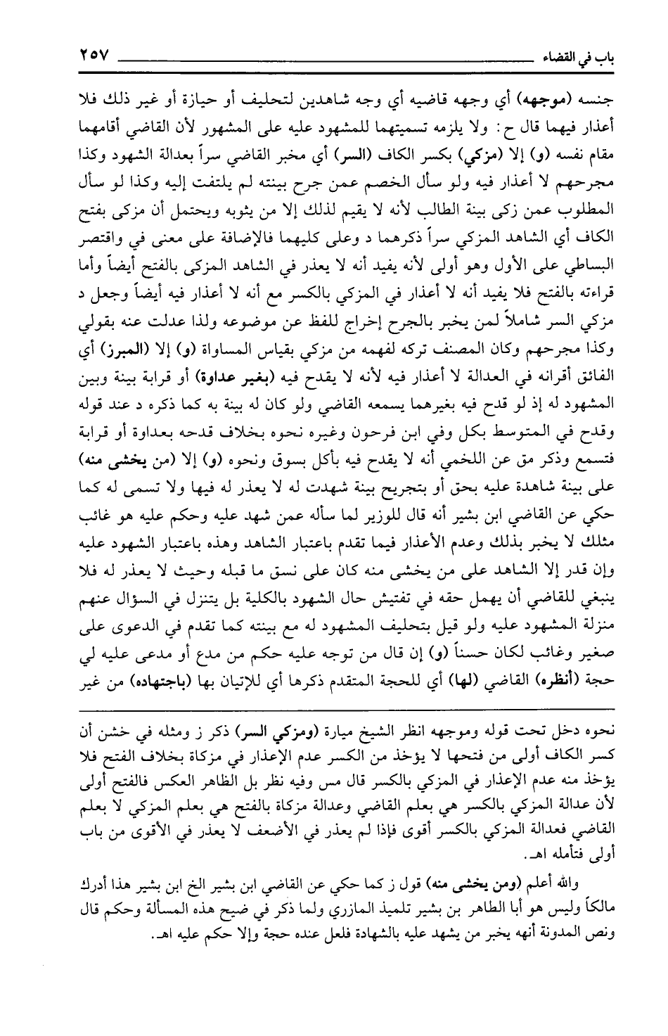 نحوه دخل تحت قوله وموجهه انظر الشيخ ميارة (ومزكي السر) ذكر ز ومثله في خشن أن كسر الكاف أولى من فتحها لا يؤخذ من الكسر عدم الإعذار في مزكاة بخلاف الفتح فلا يؤخذ منه عدم الإعذار في المزكي بالكسر قال مس وفيه نظر بل الظاهر العكس فالفتح أولى لأن عدالة المزكي بالكسر هي بعلم القاضي وعدالة مزكاة بالفتح هي بعلم المزكي لا بعلم القاضي فعدالة المزكي بالكسر أقوى فإذا لم يعذر في الأضعف لا يعذر في الأقوى من باب أولى فتأمله اهـ.