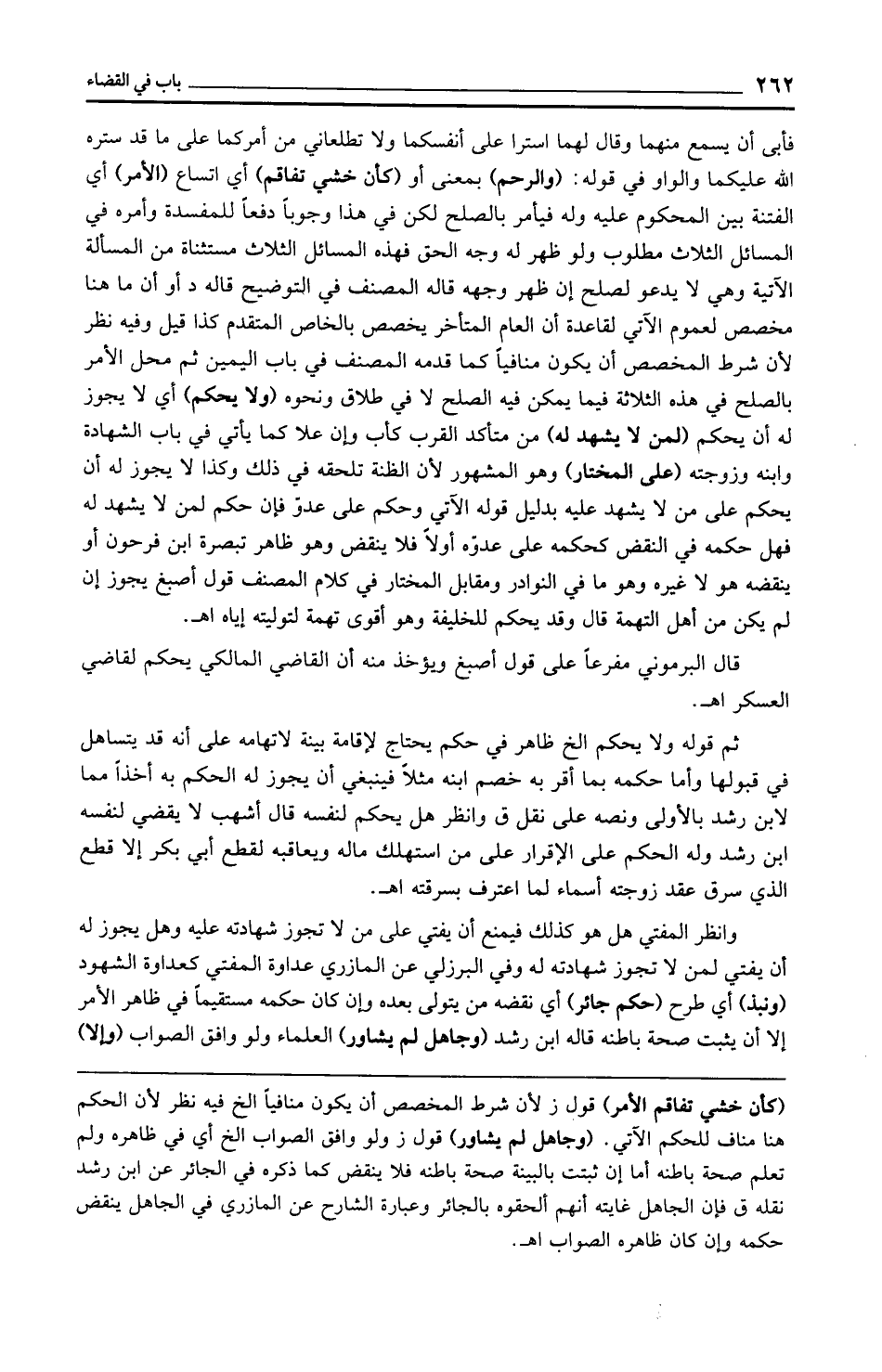 (كأن خشي تفاقم الأمر) قول ز لأن شرط المخصص أن يكون منافيًا الخ فيه نظر لأن الحكم هنا مناف للحكم الآتي. (وجاهل لم يشاور) قول ز ولو وافق الصواب الخ أي في ظاهره ولم تعلم صحة باطنه أما إن ثبتت بالبينة صحة باطنه فلا ينقض كما ذكره في الجائر عن ابن رشد نقله ق فإن الجاهل غايته أنهم ألحقوه بالجائر وعبارة الشارح عن المازري في الجاهل ينقض حكمه وإن كان ظاهره الصواب اهـ.