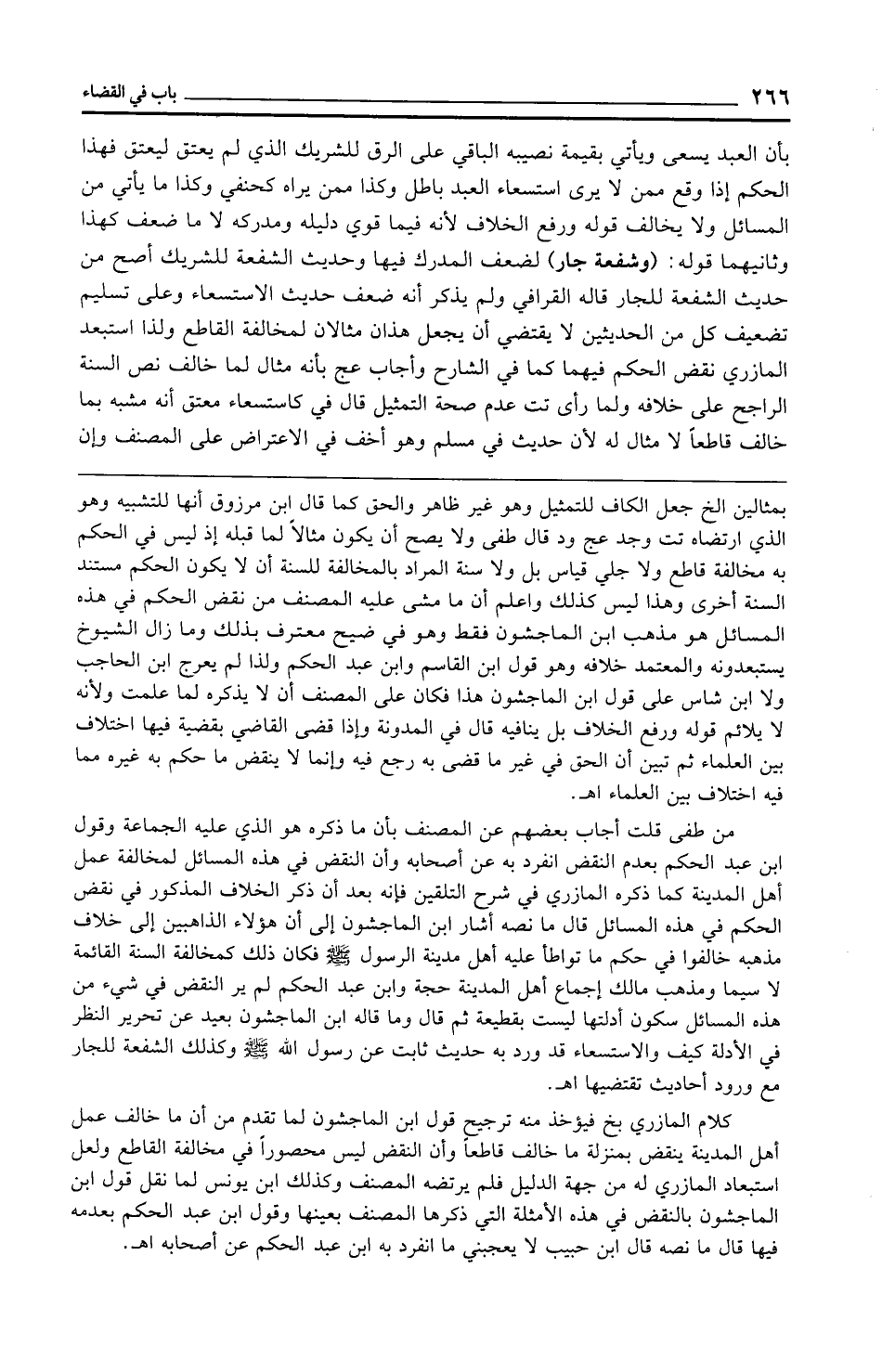 من طفى قلت أجاب بعضهم عن المصنف بأن ما ذكره هو الذي عليه الجماعة وقول ابن عبد الحكم بعدم النقض انفرد به عن أصحابه وأن النقض في هذه المسائل لمخالفة عمل أهل المدينة كما ذكره المازري في شرح التلقين فإنه بعد أن ذكر الخلاف المذكور في نقض الحكم في هذه المسائل قال ما نصه أشار ابن الماجشون إلى أن هؤلاء الذاهبين إلى خلاف مذهبه خالفوا في حكم ما تواطأ عليه أهل مدينة الرسول - صلى الله عليه وسلم - فكان ذلك كمخالفة السنة القائمة لا سيما ومذهب مالك إجماع أهل المدينة حجة وابن عبد الحكم لم ير النقض في شيء من هذه المسائل سكون أدلتها ليست بقطيعة ثم قال وما قاله ابن الماجشون بعيد عن تحرير النظر في الأدلة كيف والاستسعاء قد ورد به حديث ثابت عن رسول الله - صلى الله عليه وسلم - وكذلك الشفعة للجار مع ورود أحاديث تقتضيها اهـ.