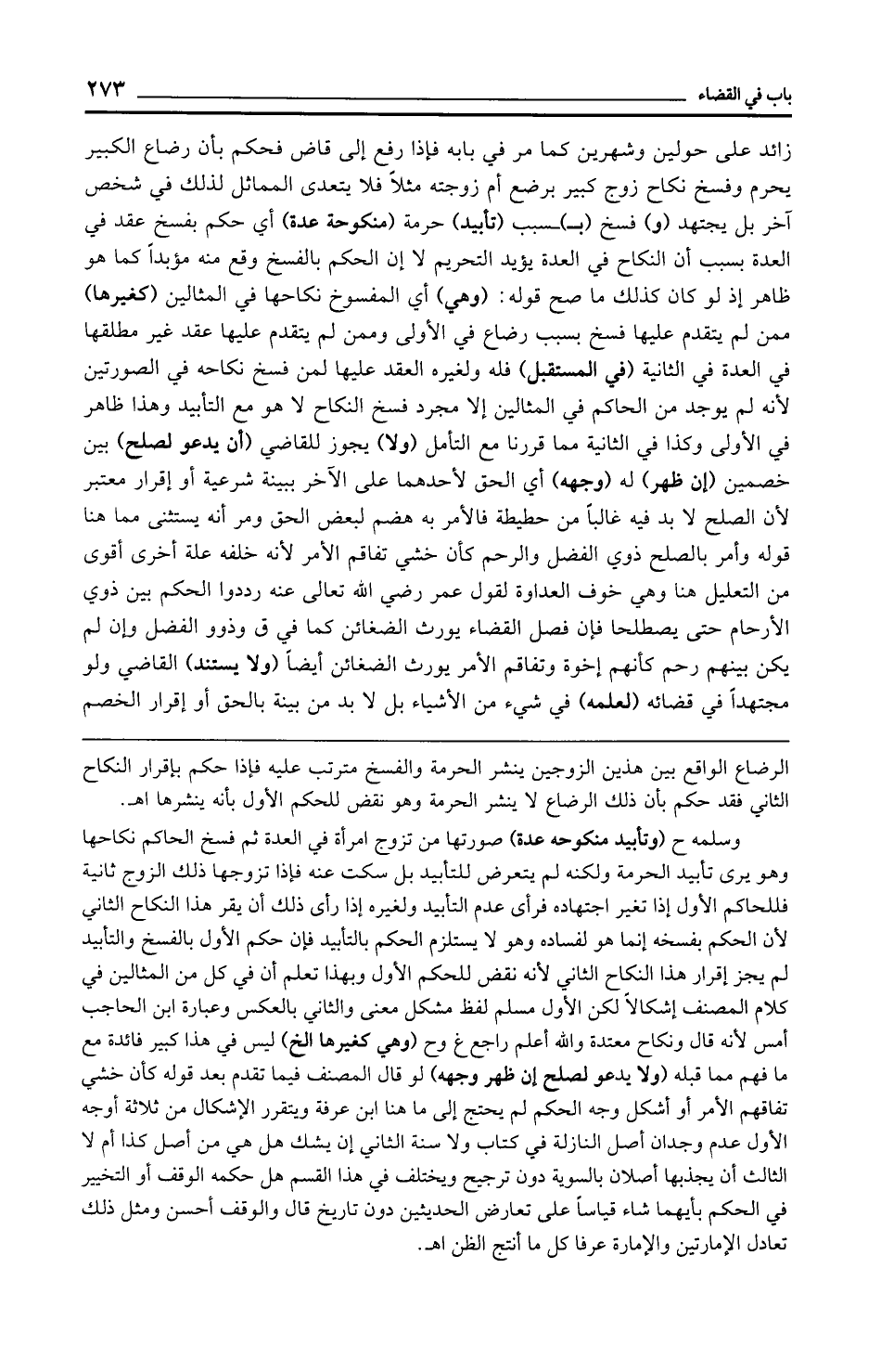 زائد على حولين وشهرين كما مر في بابه فإذا رفع إلى قاض فحكم بأن رضاع الكبير يحرم وفسخ نكاح زوج كبير برضع أم زوجته مثلًا فلا يتعدى المماثل لذلك في شخص آخر بل يجتهد (و) فسخ (بـ) ـسبب (تأبيد) حرمة (منكوحة عدة) أي حكم بفسخ عقد في العدة بسبب أن النكاح في العدة يؤيد التحريم لا إن الحكم بالفسخ وقع منه مؤبدًا كما هو ظاهر إذ لو كان كذلك ما صح قوله: (وهي) أي المفسوخ نكاحها في المثالين (كغيرها) ممن لم يتقدم عليها فسخ بسبب رضاع في الأولى وممن لم يتقدم عليها عقد غير مطلقها في العدة في الثانية (في المستقبل) فله ولغيره العقد عليها لمن فسخ نكاحه في الصورتين لأنه لم يوجد من الحاكم في المثالين إلا مجرد فسخ النكاح لا هو مع التأبيد وهذا ظاهر في الأولى وكذا في الثانية مما قررنا مع التأمل (ولا) يجوز للقاضي (أن يدعو لصلح) بين خصمين (إن ظهر) له (وجهه) أي الحق لأحدهما على الآخر ببينة شرعية أو إقرار معتبر لأن الصلح لا بد فيه غالبًا من حطيطة فالأمر به هضم لبعض الحق ومر أنه يستثنى مما هنا قوله وأمر بالصلح ذوي الفضل والرحم كأن خشي تفاقم الأمر لأنه خلفه علة أخرى أقوى من التعليل هنا وهي خوف العداوة لقول عمر رضي الله تعالى عنه رددوا الحكم بين ذوي الأرحام حتى يصطلحا فإن فصل القضاء يورث الضغائن كما في ق وذوو الفضل وإن لم يكن بينهم رحم كأنهم إخوة وتفاقم الأمر يورث الضغائن أيضًا (ولا يستند) القاضي ولو مجتهدًا في قضائه (لعلمه) في شيء من الأشياء بل لا بد من بينة بالحق أو إقرار الخصم