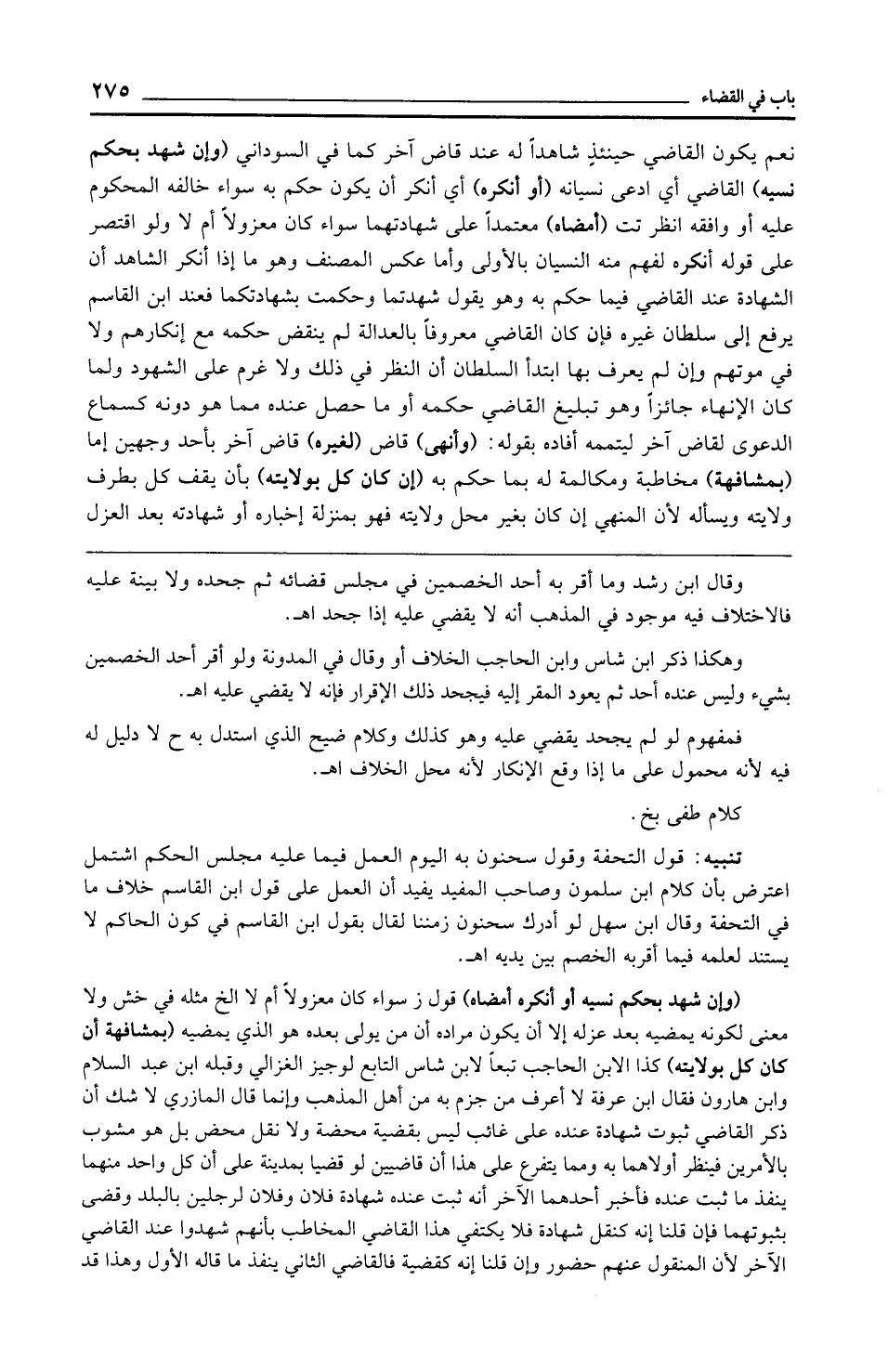 تنبيه: قول التحفة وقول سحنون به اليوم العمل فيما عليه مجلس الحكم اشتمل اعترض بأن كلام ابن سلمون وصاحب المفيد يفيد أن العمل على قول ابن القاسم خلاف ما في التحفة وقال ابن سهل لو أدرك سحنون زمننا لقال بقول ابن القاسم في كون الحاكم لا يستند لعلمه فيما أقربه الخصم بين يديه اهـ.