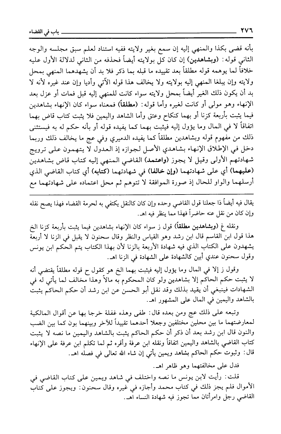 وتبعه على ذلك عج ومن بعده قال: طفى وهذه غفلة خرجا بها عن أقوال المالكية لمعارضتهما ما بين محلين مختلفين وجعلا أحدهما تقييدًا للآخر وبينهما بنون كما بين الضب والنون قال ابن رشد بعد أن ذكر أن حكم الحاكم يثبت بالشاهد واليمين ما نصه لا يثبت كتاب القاضي بالشاهد واليمين اتفاقًا ونقله ابن عرفة وأقره ثم لما تكلم ابن عرفة على الإنهاء قال: وثبوت حكم الحاكم بشاهد ويمين يأتي إن شاء الله تعالى في فصله اهـ.