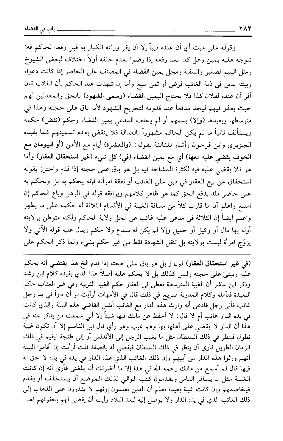 (في غير استحقاق العقار) قول ز بل هو باق على حجته إذا قدم الخ هذا يقتضي أنه يحكم عليه ويبقى على حجته وليس كذلك بل لا يحكم عليه أصلًا هذا الذي يفيده كلام ابن رشد وذكر ابن عاشر أن الغيبة المتوسطة تعطي في العقار حكم الغيبة القريبة وفي غير العقاب حكم البعيدة فتأمله وكلام المدونة صريح في ذلك قال في الأمهات أرأيت لو أن دارًا في يد رجل غائب فأتى رجل فادعى أنه وارث هذه الدار مع الغائب أيقبل القاضي هذه البينة والذي كانت في يده الدار غائب أم لا قال: لا أحفظ عن مالك فيها شيئًا إلا أني سمعت من يذكر عنه في هذا أن الدار لا يقضي على أهلها بها وهم غيب وهو رأي قال ابن القاسم إلا أن تكون غيبة تطول فينظر في ذلك السلطان مثل ما يغيب الرجل إلى الأندلس أو إلى طنجة ليقيم في ذلك الزمان الطويل فأرى أن ينظر في ذلك السلطان فيقضي له بالصفة قلت أرأيت إن أقاموا البينة أنهم ورثوا هذه الدار من أبيهم وإن ذلك الغائب الذي هذه الدار في يده في يده لا حق له فيها قال لم أسمع من مالك رحمه الله في هذا إلا ما أخبرتك أنه بلغني فأرى أنه إن كانت الغيبة مثل ما يسافر الناس ويقدمون كتب الوالي لذلك الموضع أن يستخلف أو يقدم فيخاصمهم وإن كانت غيبة بعيدة يعلم أن الذين يعلمون إرثهم لا يقدرون على الذهاب إلى ذلك الغائب الذي في يده الدار ولا يوصل إليه لبعد البلاد رأيت أن يقضى لهم بحقوقهم اهـ.