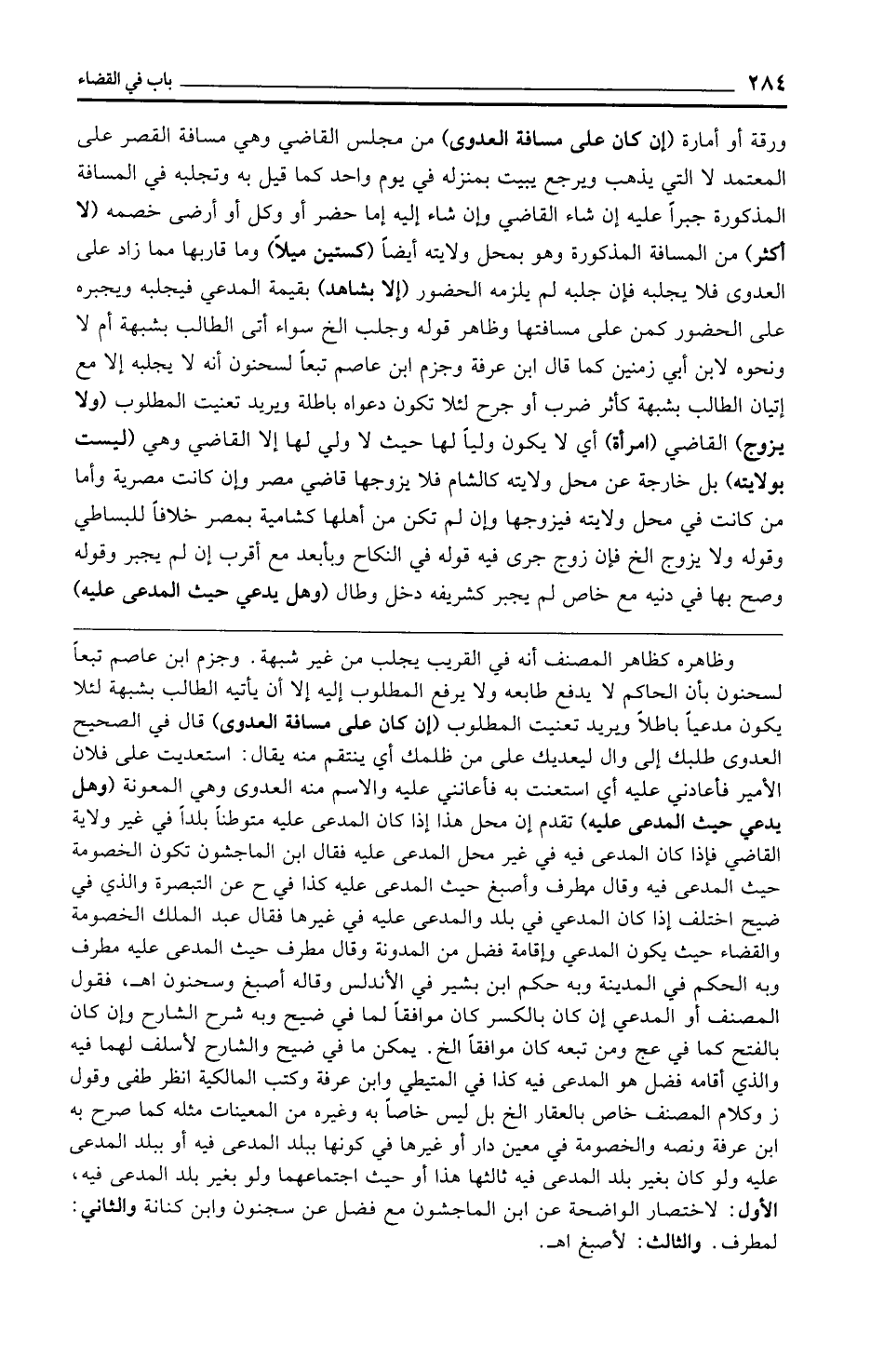 ورقة أو أمارة (إن كان على مسافة العدوى) من مجلس القاضي وهي مسافة القصر على المعتمد لا التي يذهب ويرجع يبيت بمنزله في يوم واحد كما قيل به وتجلبه في المسافة المذكورة جبرًا عليه إن شاء القاضي وإن شاء إليه إما حضر أو وكل أو أرضى خصمه (لا أكثر) من المسافة المذكورة وهو بمحل ولايته أيضًا (كستين ميلًا) وما قاربها مما زاد على العدوى فلا يجلبه فإن جلبه لم يلزمه الحضور (إلا بشاهد) بقيمة المدعي فيجلبه ويجبره على الحضور كمن على مسافتها وظاهر قوله وجلب الخ سواء أتى الطالب بشبهة أم لا ونحوه لابن أبي زمنين كما قال ابن عرفة وجزم ابن عاصم تبعًا لسحنون أنه لا يجلبه إلا مع إتيان الطالب بشبهة كأثر ضرب أو جرح لئلا تكون دعواه باطلة ويريد تعنيت المطلوب (ولا يزوج) القاضي (امرأة) أي لا يكون وليًّا لها حيث لا ولي لها إلا القاضي وهي (ليست بولايته) بل خارجة عن محل ولايته كالشام فلا يزوجها قاضي مصر وإن كانت مصرية وأما من كانت في محل ولايته فيزوجها وإن لم تكن من أهلها كشامية بمصر خلافًا للبساطي وقوله ولا يزوج الخ فإن زوج جرى فيه قوله في النكاح وبأبعد مع أقرب إن لم يجبر وقوله وصح بها في دنيه مع خاص لم يجبر كشريفه دخل وطال (وهل يدعي حيث المدعى عليه)