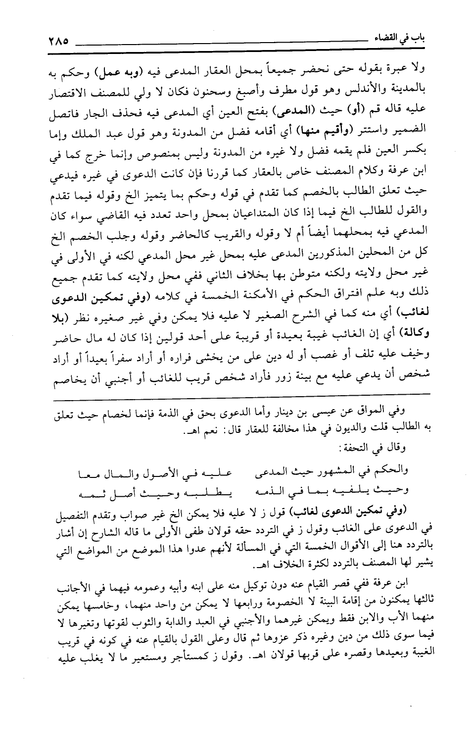 ولا عبرة بقوله حتى نحضر جميعًا بمحل العقار المدعى فيه (وبه عمل) وحكم به بالمدينة والأندلس وهو قول مطرف وأصبغ وسحنون فكان لا ولي للمصنف الاقتصار عليه قاله قم (أو) حيث (المدعى) بفتح العين أي المدعى فيه فحذف الجار فاتصل الضمير واستتر (وأقيم منها) أي أقامه فضل من المدونة وهو قول عبد الملك وإما بكسر العين فلم يقمه فضل ولا غيره من المدونة وليس بمنصوص وإنما خرج كما في ابن عرفة وكلام المصنف خاص بالعقار كما قررنا فإن كانت الدعوى في غيره فيدعي حيث تعلق الطالب بالخصم كما تقدم في قوله وحكم بما يتميز الخ وقوله فيما تقدم والقول للطالب الخ فيما إذا كان المتداعيان بمحل واحد تعدد فيه القاضي سواء كان المدعي فيه بمحلهما أيضًا أم لا وقوله والقريب كالحاضر وقوله وجلب الخصم الخ كل من المحلين المذكورين المدعى عليه بمحل غير محل المدعي لكنه في الأولى في غير محل ولايته ولكنه متوطن بها بخلاف الثاني ففي محل ولايته كما تقدم جميع ذلك وبه علم افتراق الحكم في الأمكنة الخمسة في كلامه (وفي تمكين الدعوى لغائب) أي منه كما في الشرح الصغير لا عليه فلا يمكن وفي غير صغيره نظر (بلا وكالة) أي إن الغائب غيبة بعيدة أو قريبة على أحد قولين إذا كان له مال حاضر وخيف عليه تلف أو غصب أو له دين على من يخشى فراره أو أراد سفرًا بعيدًا أو أراد شخص أن يدعي عليه مع بينة زور فأراد شخص قريب للغائب أو أجنبي أن يخاصم