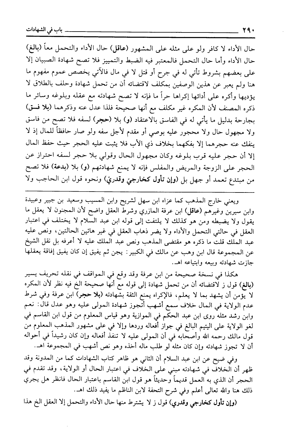 حال الأداء لا كافر ولو على مثله على المشهور (عاقل) حال الأداء والتحمل معًا (بالغ) حال الأداء وأما حال التحمل فالمعتبر فيه الضبط والتمييز فلا تصح شهادة الصبيان إلا على بعضهم بشروط تأتي له في جرح أو قتل لا في مال فالآتي يخصص عموم مفهوم ما هنا ولم يعبر عن هذين الوصفين بمكلف لاقتضائه أن من تحمل شهادة وحلف بالطلاق لا يؤديها وأكره على أدائها إكراها حرًّا ما فإنه لا تصح شهادته مع عقله وبلوغه وسائر ما ذكره المصنف لأن المكره غير مكلف مع أنها صحيحة فلذا عدل عنه وذكرهما (بلا فسق) بجارحة بدليل ما يأتي له في الفاسق بالاعتقاد (و) بلا (حجر) لسفه فلا تصح من فاسق ولا مجهول حال ولا محجور عليه بوصي أو مقدم لأجل سفه ولو صار حافظًا للمال إذ لا ينفك عنه حجرهما إلا بفكهما بخلاف ذي الأب فلا يثبت عليه الحجر حيث حفظ المال إلا أن حجر عليه قرب بلوغه وكان مجهول الحال وقولي بلا حجر لسفه احتراز عن الحجر على الزوجة والمريض والمفلس فإنه لا يمنع شهادتهم (و) بلا (بدعة) فلا تصح من مبتدع تعمد أو جهل بل (وإن تأول كخارجيّ وقدريّ) ونحوه قول ابن الحاجب ولا