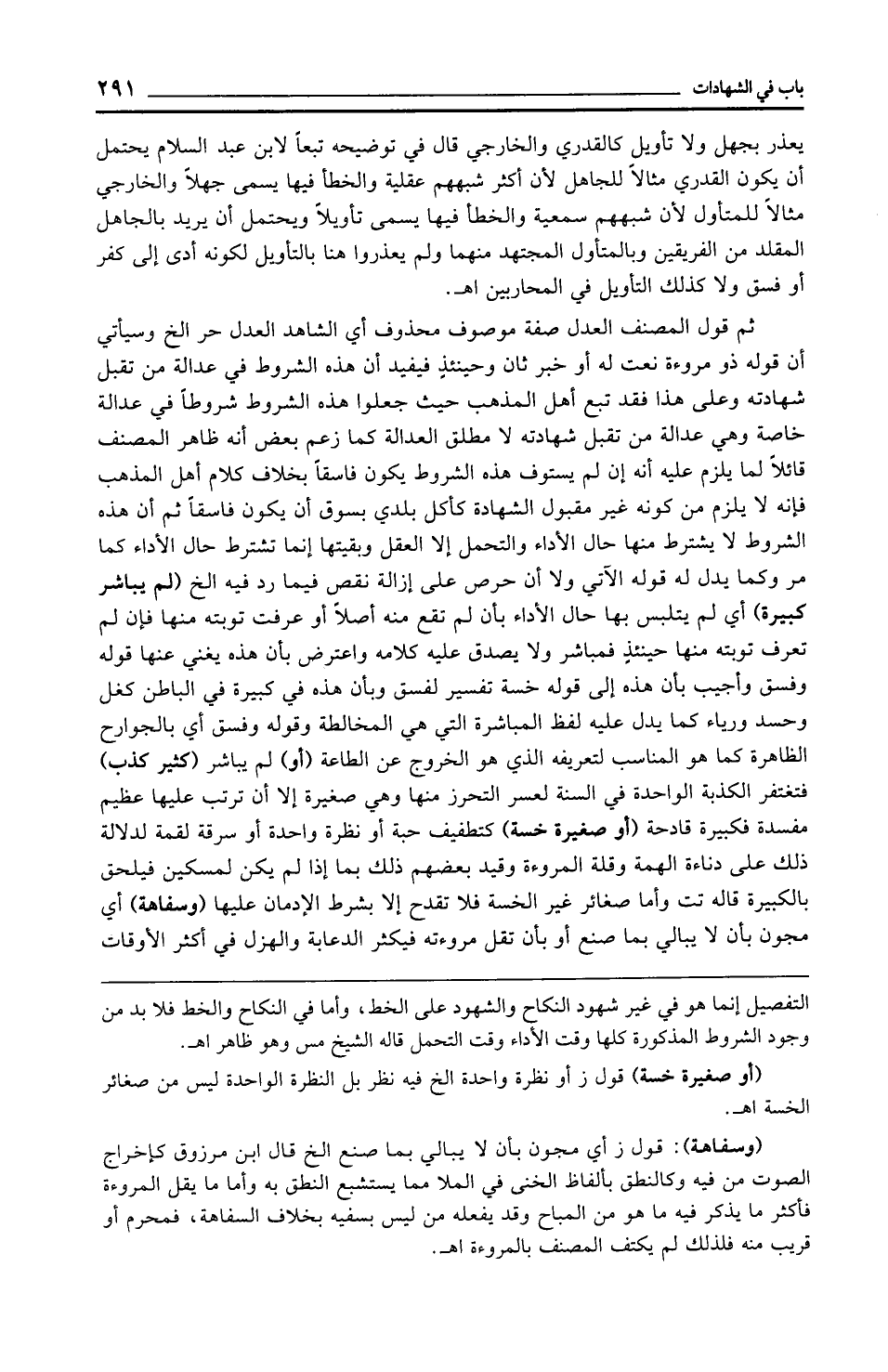 ثم قول المصنف العدل صفة موصوف محذوف أي الشاهد العدل حر الخ وسيأتي أن قوله ذو مروءة نعت له أو خبر ثان وحينئذٍ فيفيد أن هذه الشروط في عدالة من تقبل شهادته وعلى هذا فقد تبع أهل المذهب حيث جعلوا هذه الشروط شروطًا في عدالة خاصة وهي عدالة من تقبل شهادته لا مطلق العدالة كما زعم بعض أنه ظاهر المصنف قائلًا لما يلزم عليه أنه إن لم يستوف هذه الشروط يكون فاسقًا بخلاف كلام أهل المذهب فإنه لا يلزم من كونه غير مقبول الشهادة كأكل بلدي بسوق أن يكون فاسقًا ثم أن هذه الشروط لا يشترط منها حال الأداء والتحمل إلا العقل وبقيتها إنما تشترط حال الأداء كما مر وكما يدل له قوله الآتي ولا أن حرص على إزالة نقص فيما رد فيه الخ (لم يباشر كبيرة) أي لم يتلبس بها حال الأداء بأن لم تقع منه أصلًا أو عرفت توبته منها فإن لم تعرف توبته منها حينئذٍ فمباشر ولا يصدق عليه كلامه واعترض بأن هذه يغني عنها قوله وفسق وأجيب بأن هذه إلى قوله خسة تفسير لفسق وبأن هذه في كبيرة في الباطن كغل وحسد ورياء كما يدل عليه لفظ المباشرة التي هي المخالطة وقوله وفسق أي بالجوارح الظاهرة كما هو المناسب لتعريفه الذي هو الخروج عن الطاعة (أو) لم يباشر (كثير كذب) فتغتفر الكذبة الواحدة في السنة لعسر التحرز منها وهي صغيرة إلا أن ترتب عليها عظيم مفسدة فكبيرة قادحة (أو صغيرة خسة) كتطفيف حبَّة أو نظرة واحدة أو سرقة لقمة لدلالة ذلك على دناءة الهمة وقلة المروءة وقيد بعضهم ذلك بما إذا لم يكن لمسكين فيلحق بالكبيرة قاله تت وأما صغائر غير الخسة فلا تقدح إلا بشرط الإدمان عليها (وسفاهة) أي مجون بأن لا يبالي بما صنع أو بأن تقل مروءته فيكثر الدعابة والهزل في أكثر الأوقات