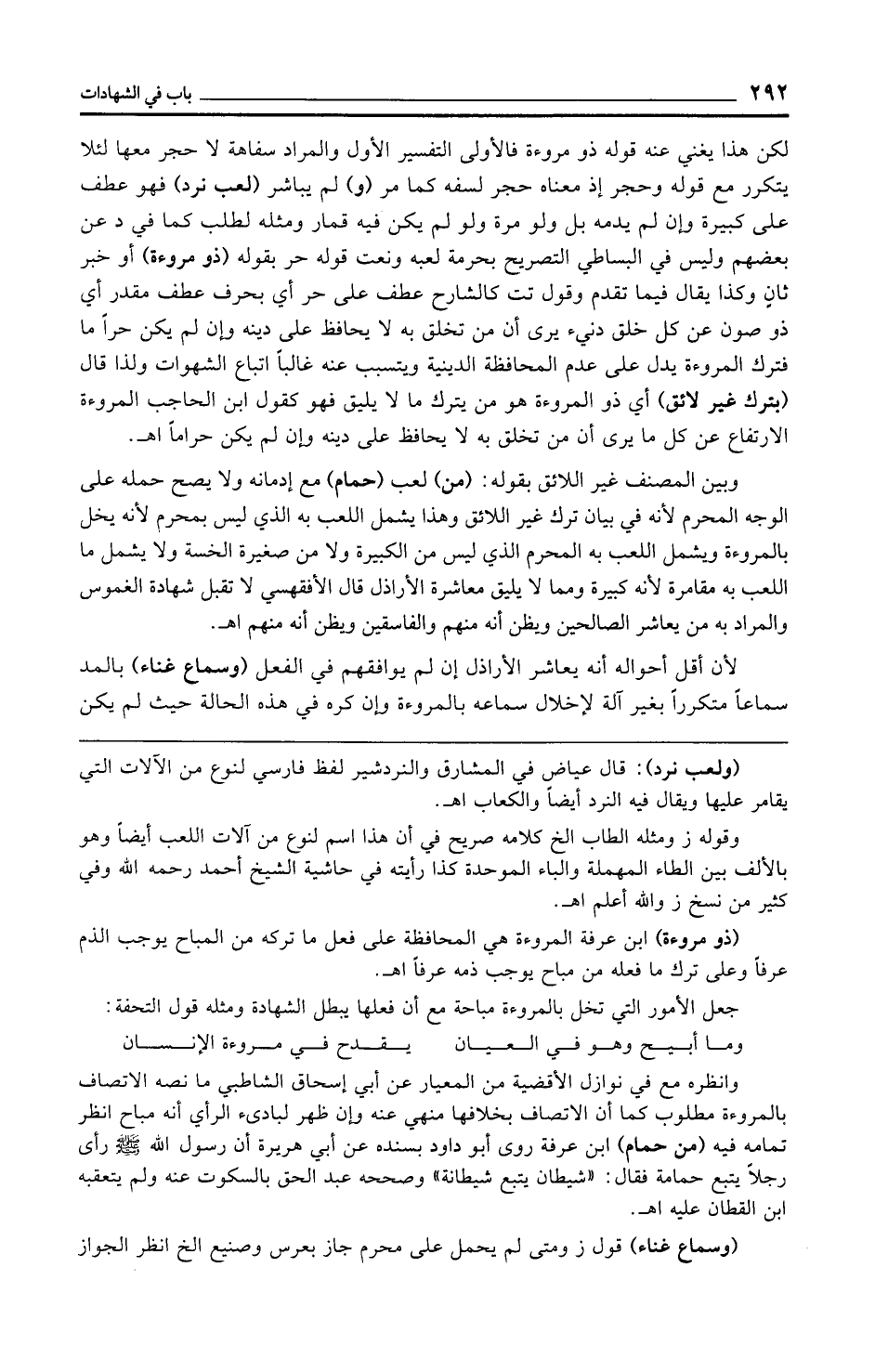 لكن هذا يغني عنه قوله ذو مروءة فالأولى التفسير الأول والمراد سفاهة لا حجر معها لئلا يتكرر مع قوله وحجر إذ معناه حجر لسفه كما مر (و) لم يباشر (لعب نرد) فهو عطف على كبيرة وإن لم يدمه بل ولو مرة ولو لم يكن فيه قمار ومثله لطلب كما في د عن بعضهم وليس في البساطي التصريح بحرمة لعبه ونعت قوله حر بقوله (ذو مروءة) أو خبر ثانٍ وكذا يقال فيما تقدم وقول تت كالشارح عطف على حر أي بحرف عطف مقدر أي ذو صون عن كل خلق دنيء يرى أن من تخلق به لا يحافظ على دينه وإن لم يكن حرًّا ما فترك المروءة يدل على عدم المحافظة الدينية ويتسبب عنه غالبًا اتباع الشهوات ولذا قال (بترك غير لائق) أي ذو المروءة هو من يترك ما لا يليق فهو كقول ابن الحاجب المروءة الارتفاع عن كل ما يرى أن من تخلق به لا يحافظ على دينه وإن لم يكن حرامًا اهـ.
