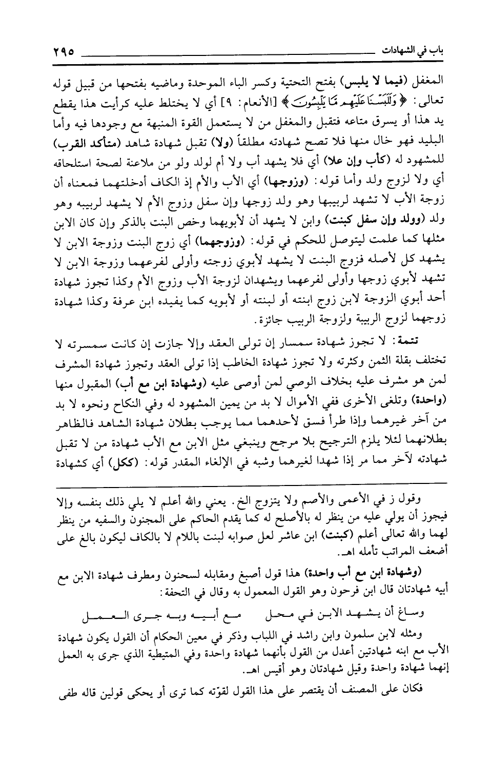 المغفل (فيما لا يلبس) بفتح التحتية وكسر الباء الموحدة وماضيه بفتحها من قبيل قوله تعالى: {وَلَلَبَسْنَا عَلَيْهِمْ مَا يَلْبِسُونَ} [الأنعام: 9] أي لا يختلط عليه كرأيت هذا يقطع يد هذا أو يسرق متاعه فتقبل والمغفل من لا يستعمل القوة المنبهة مع وجودها فيه وأما البليد فهو خال منها فلا تصح شهادته مطلقًا (ولا) تقبل شهادة شاهد (متأكد القرب) للمشهود له (كأب وإن علا) أي فلا يشهد أب ولا أم لولد ولو من ملاعنة لصحة استلحاقه أي ولا لزوج ولد وأما قوله: (وزوجها) أي الأب والأم إذ الكاف أدخلتهما فمعناه أن زوجة الأب لا تشهد لربيبها وهو ولد زوجها وإن سفل وزوج الأم لا يشهد لربيبه وهو ولد (وولد وإن سفل كبنت) وابن لا يشهد أن لأبويهما وخص البنت بالذكر وإن كان الابن مثلها كما علمت ليتوصل للحكم في قوله: (وزوجهما) أي زوج البنت وزوجة الابن لا يشهد كل لأصله فزوج البنت لا يشهد لأبوي زوجته وأولى لفرعهما وزوجة الابن لا تشهد لأبوي زوجها وأولى لفرعهما ويشهدان لزوجة الأب وزوج الأم وكذا تجوز شهادة أحد أبوي الزوجة لابن زوج ابنته أو لبنته أو لأبويه كما يفيده ابن عرفة وكذا شهادة زوجهما لزوج الربيبة ولزوجة الربيب جائزة.