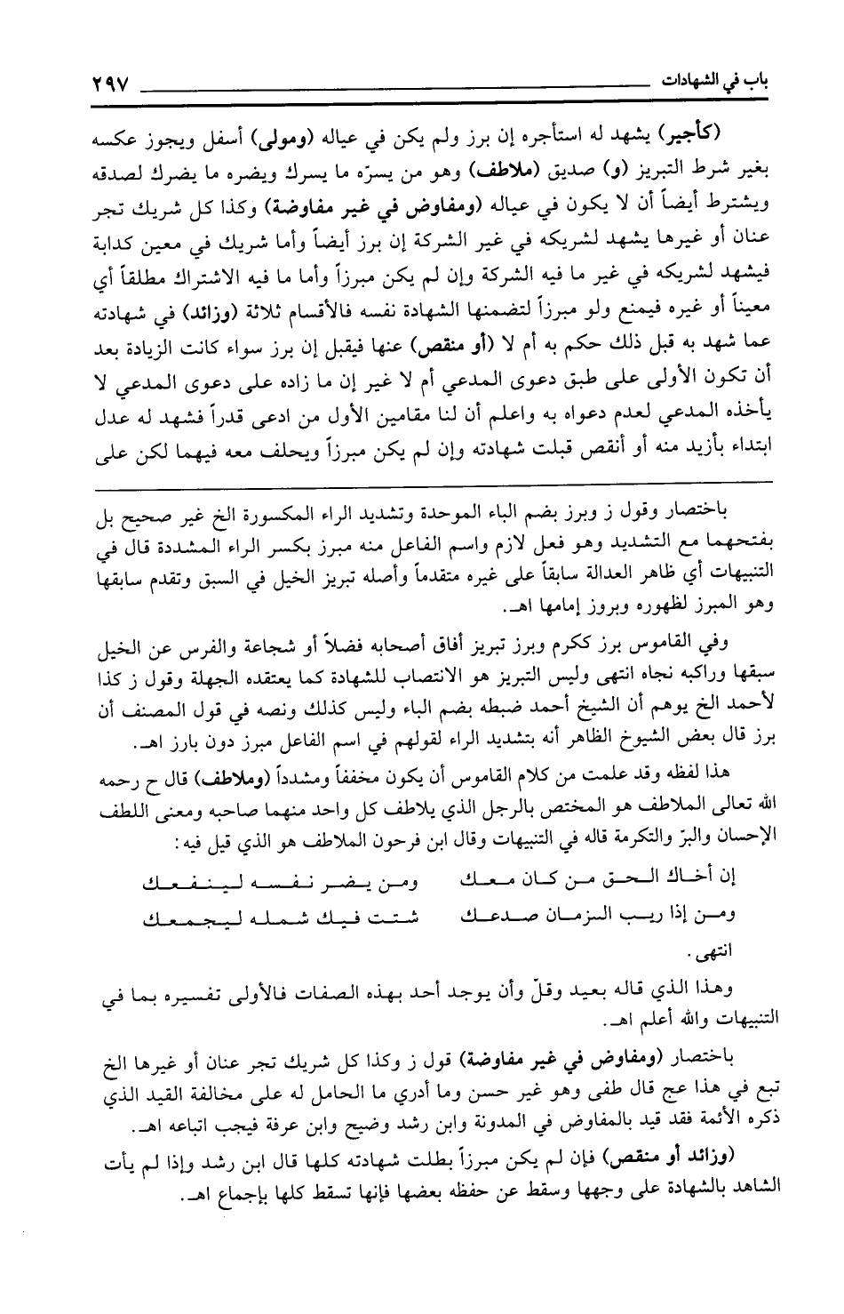 (كأجير) يشهد له استأجره إن برز ولم يكن في عياله (ومولى) أسفل ويجوز عكسه بغير شرط التبريز (و) صديق (ملاطف) وهو من يسرّه ما يسرك ويضره ما يضرك لصدقه ويشترط أيضًا أن لا يكون في عياله (ومفاوض في غير مفاوضة) وكذا كل شريك تجر عنان أو غيرها يشهد لشريكه في غير الشركة إن برز أيضًا وأما شريك في معين كدابة فيشهد لشريكه في غير ما فيه الشركة وإن لم يكن مبرزًا وأما ما فيه الاشتراك مطلقًا أي معينًا أو غيره فيمنع ولو مبرزًا لتضمنها الشهادة نفسه فالأقسام ثلاثة (وزائد) في شهادته عما شهد به قبل ذلك حكم به أم لا (أو منقص) عنها فيقبل إن برز سواء كانت الزيادة بعد أن تكون الأولى على طبق دعوى المدعي أم لا غير إن ما زاده على دعوى المدعي لا يأخذه المدعي لعدم دعواه به واعلم أن لنا مقامين الأول من ادعى قدرًا فشهد له عدل ابتداء بأزيد منه أو أنقص قبلت شهادته وإن لم يكن مبرزًا ويحلف معه فيهما لكن على