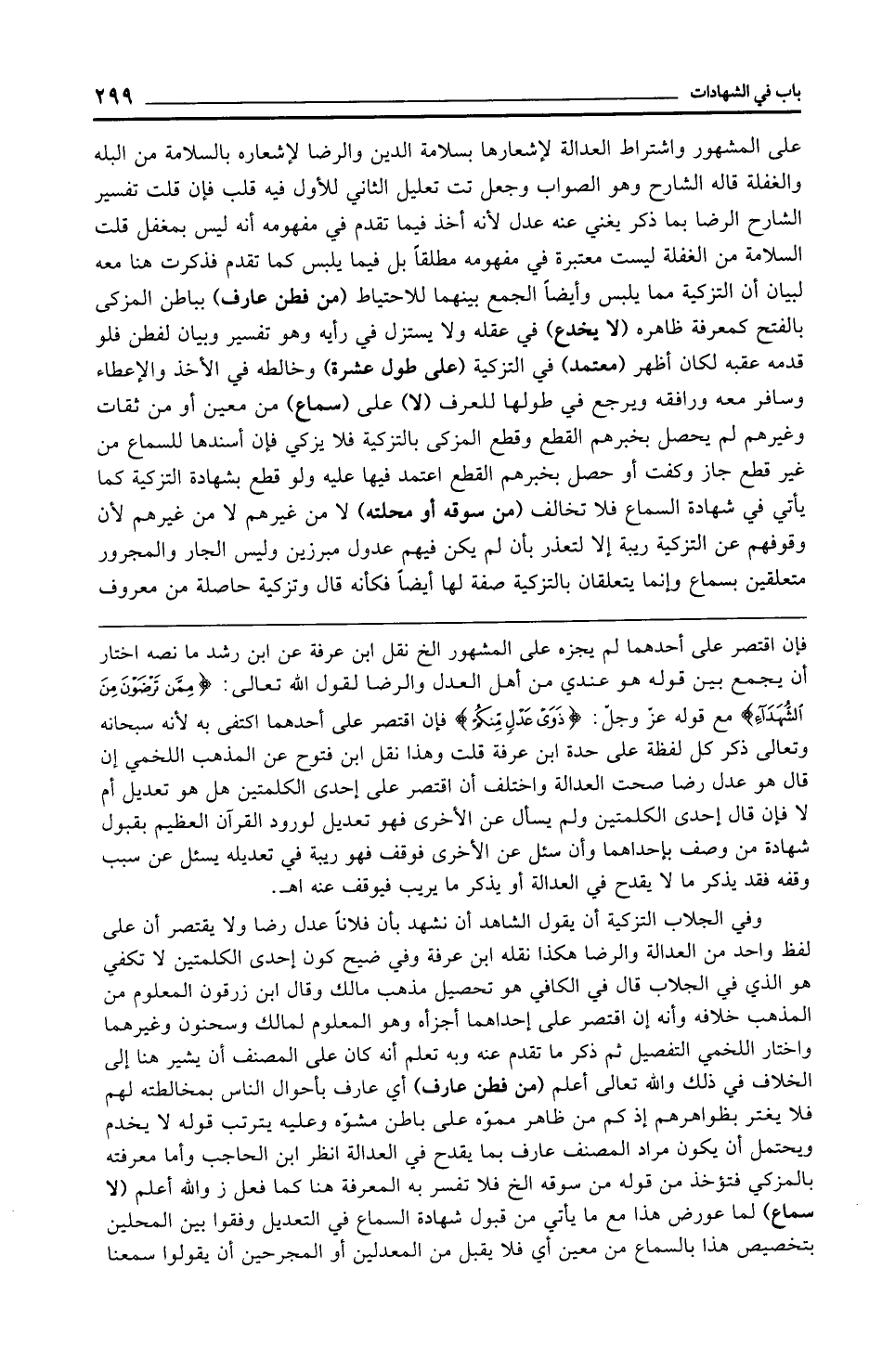 فإن اقتصر على أحدهما لم يجزه على المشهور الخ نقل ابن عرفة عن ابن رشد ما نصه اختار أن يجمع بين قوله هو عندي من أهل العدل والرضا لقول الله تعالى: {مِمَّنْ تَرْضَوْنَ مِنَ الشُّهَدَاءِ} مع قوله عزَّ وجلَّ: {ذَوَيْ عَدْلٍ مِنْكُمْ} فإن اقتصر على أحدهما اكتفى به لأنه سبحانه وتعالى ذكر كل لفظة على حدة ابن عرفة قلت وهذا نقل ابن فتوح عن المذهب اللخمي إن قال هو عدل رضا صحت العدالة واختلف أن اقتصر على إحدى الكلمتين هل هو تعديل أم لا فإن قال إحدى الكلمتين ولم يسأل عن الأخرى فهو تعديل لورود القرآن العظيم بقبول شهادة من وصف بإحداهما وأن سئل عن الأخرى فوقف فهو ريبة في تعديله يسئل عن سبب وقفه فقد يذكر ما لا يقدح في العدالة أو يذكر ما يريب فيوقف عنه اهـ.