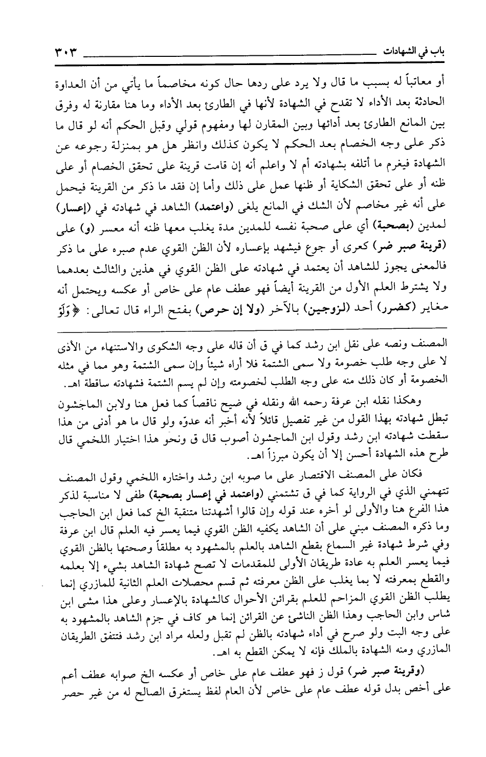 أو معاتبًا له بسبب ما قال ولا يرد على ردها حال كونه مخاصمًا ما يأتي من أن العداوة الحادثة بعد الأداء لا تقدح في الشهادة لأنها في الطارئ بعد الأداء وما هنا مقارنة له وفرق بين المانع الطارئ بعد أدائها وبين المقارن لها ومفهوم قولي وقبل الحكم أنه لو قال ما ذكر على وجه الخصام بعد الحكم لا يكون كذلك وانظر هل هو بمنزلة رجوعه عن الشهادة فيغرم ما أتلفه بشهادته أم لا واعلم أنه إن قامت قرينة على تحقق الخصام أو على ظنه أو على تحقق الشكاية أو ظنها عمل على ذلك وأما إن فقد ما ذكر من القرينة فيحمل على أنه غير مخاصم لأن الشك في المانع يلغى (واعتمد) الشاهد في شهادته في (إعسار) لمدين (بصحبة) أي على صحبة نفسه للمدين مدة يغلب معها ظنه أنه معسر (و) على (قرينة صبر ضر) كعرى أو جوع فيشهد بإعساره لأن الظن القوي عدم صبره على ما ذكر فالمعنى يجوز للشاهد أن يعتمد في شهادته على الظن القوي في هذين والثالث بعدهما ولا يشترط العلم الأول من القرينة أيضًا فهو عطف عام على خاص أو عكسه ويحتمل أنه مغاير (كضرر) أحد (لزوجين) بالآخر (ولا إن حرص) بفتح الراء قال تعالى: {وَلَوْ