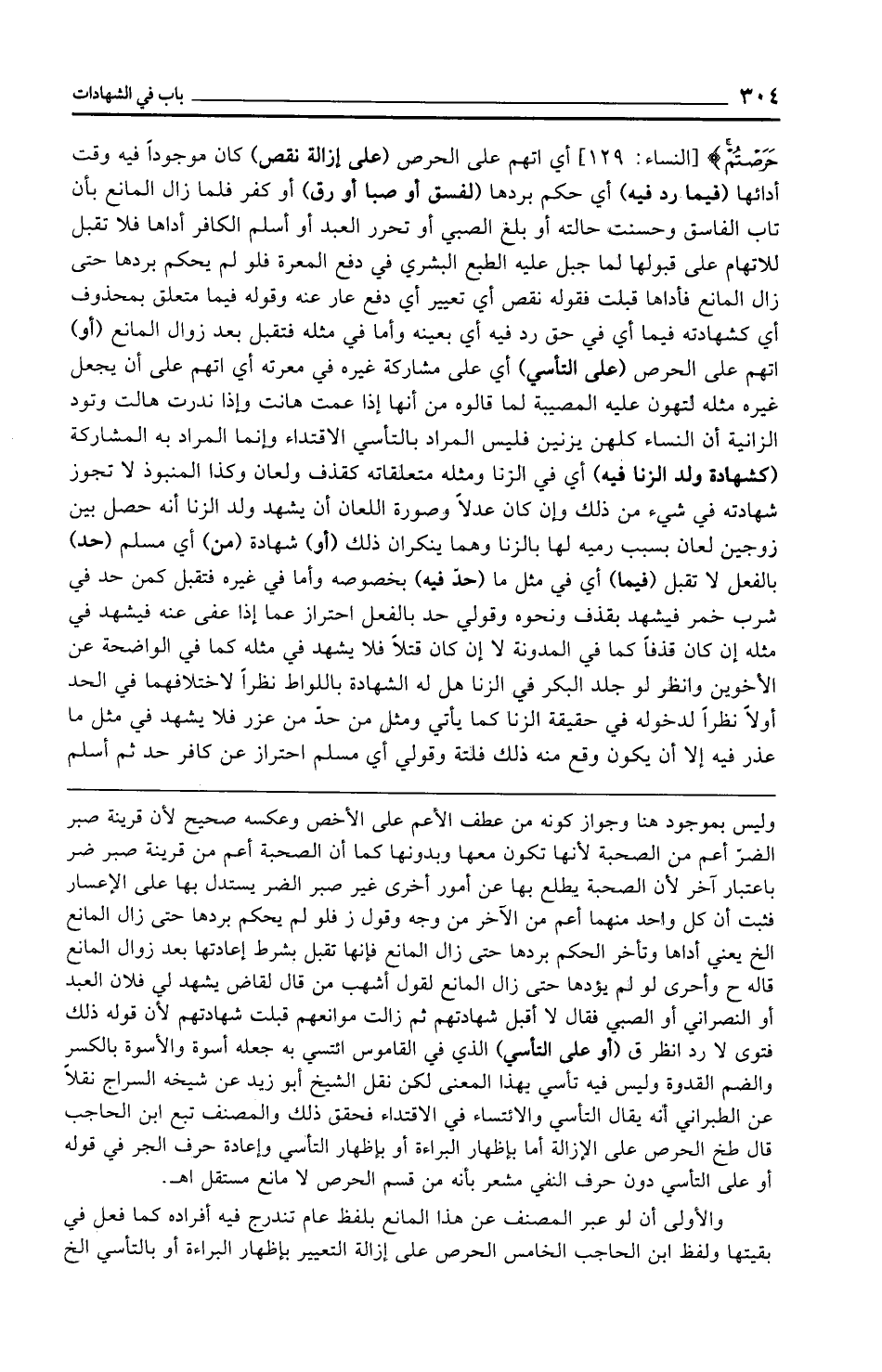 حَرَصْتُمْ} [النساء: 129] أي اتهم على الحرص (على إزالة نقص) كان موجودًا فيه وقت أدائها (فيما رد فيه) أي حكم بردها (لفسق أو صبا أو رق) أو كفر فلما زال المانع بأن تاب الفاسق وحسن حالته أو بلغ الصبي أو تحرر العبد أو أسلم الكافر أداها فلا تقبل للاتهام على قبولها لما جبل عليه الطبع البشري في دفع المعرة فلو لم يحكم بردها حتى زال المانع فأداها قبلت فقوله نقص أي تعيير أي دفع عار عنه وقوله فيما متعلق بمحذوف أي كشهادته فيما أي في حق رد فيه أي بعينه وأما في مثله فتقبل بعد زوال المانع (أو) اتهم على الحرص (على التأسي) أي على مشاركة غيره في معرته أي اتهم على أن يجعل غيره مثله لتهون عليه المصيبة لما قالوه من أنها إذا عمت هانت وإذا ندرت هالت وتود الزانية أن النساء كلهن يزنين فليس المراد بالتأسي الاقتداء وإنما المراد به المشاركة (كشهادة ولد الزنا فيه) أي في الزنا ومثله متعلقاته كقذف ولعان وكذا المنبوذ لا تجوز شهادته في شيء من ذلك وإن كان عدلًا وصورة اللعان أن يشهد ولد الزنا أنه حصل بين زوجين لعان بسبب رميه لها بالزنا وهما ينكران ذلك (أو) شهادة (من) أي مسلم (حد) بالفعل لا تقبل (فيما) أي في مثل ما (حدّ فيه) بخصوصه وأما في غيره فتقبل كمن حد في شرب خمر فيشهد بقذف ونحوه وقولي حد بالفعل احتراز عما إذا عفى عنه فيشهد في مثله إن كان قذفًا كما في المدونة لا إن كان قتلًا فلا يشهد في مثله كما في الواضحة عن الأخوين وانظر لو جلد البكر في الزنا هل له الشهادة باللواط نظرًا لاختلافهما في الحد أولًا نظرًا لدخوله في حقيقة الزنا كما يأتي ومثل من حدّ من عزر فلا يشهد في مثل ما عذر فيه إلا أن يكون وقع منه ذلك فلتة وقولي أي مسلم احتراز عن كافر حد ثم أسلم