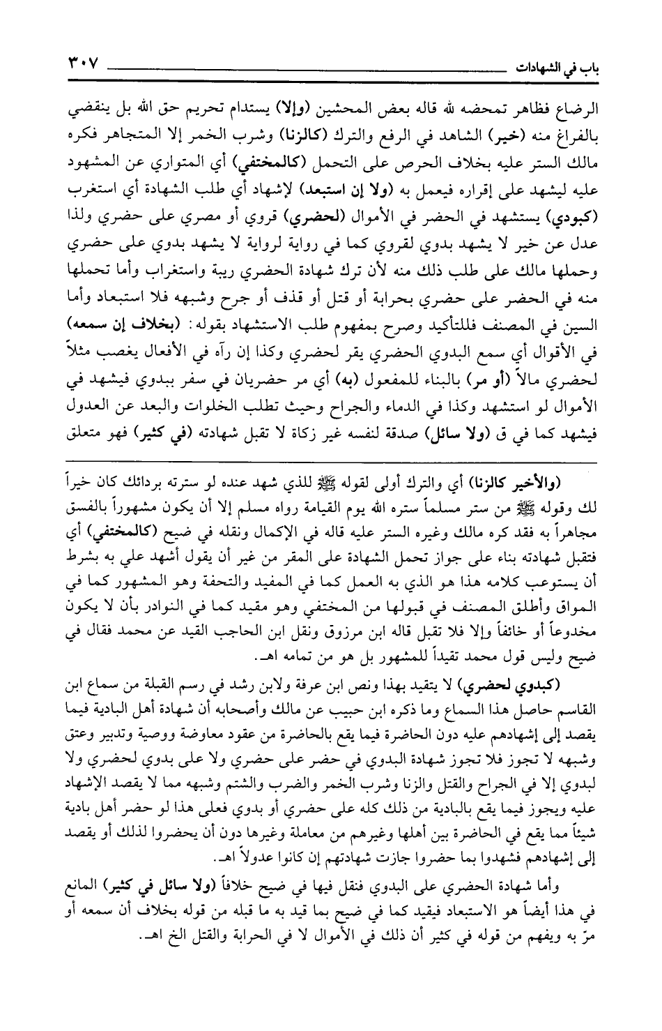 (كبدوي لحضري) لا يتقيد بهذا ونص ابن عرفة ولابن رشد في رسم القبلة من سماع ابن القاسم حاصل هذا السماع وما ذكره ابن حبيب عن مالك وأصحابه أن شهادة أهل البادية فيما يقصد إلى إشهادهم عليه دون الحاضرة فيما يقع بالحاضرة من عقود معاوضة ووصية وتدبير وعتق وشبهه لا تجوز فلا تجوز شهادة البدوي في حضر على حضري ولا على بدوي لحضري ولا لبدوي إلا في الجراح والقتل والزنا وشرب الخمر والضرب والشتم وشبهه مما لا يقصد الإشهاد عليه ويجوز فيما يقع بالبادية من ذلك كله على حضري أو بدوي فعلى هذا لو حضر أهل بادية شيئًا مما يقع في الحاضرة بين أهلها وغيرهم من معاملة وغيرها دون أن يحضروا لذلك أو يقصد إلى إشهادهم فشهدوا بما حضروا جازت شهادتهم إن كانوا عدولًا اهـ.