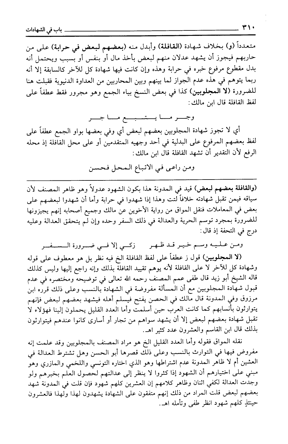 متعددًا (و) بخلاف شهادة (القافلة) وأبدل منه (بعضهم لبعض في حرابة) على من حاربهم فيجوز أن يشهد عدلان منهم لبعض بأخذ مال أو بنفس أو بسبب ويحتمل أنه بدل مقطوع مرفوع خبره في حرابة وهذه وإن كانت فيها شهادة كل للآخر كالسابقة إلا أنه ربما يتوهم في هذه عدم الجواز لما بينهم وبين المحاربين من العداوة الدنيوية فقبلت هنا للضرورة (لا المجلوبين) كذا في بعض النسخ بياء الجمع وهو مجرور فقط عطفًا على لفظ القافلة قال ابن مالك: