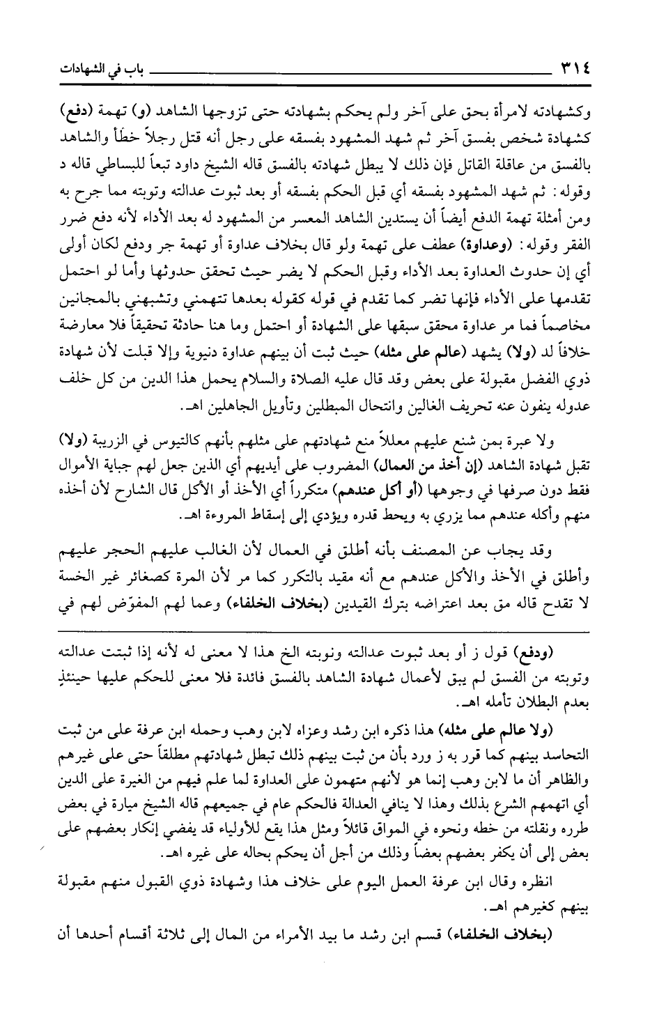 وكشهادته لامرأة بحق على آخر ولم يحكم بشهادته حتى تزوجها الشاهد (و) تهمة (دفع) كشهادة شخص بفسق آخر ثم شهد المشهود بفسقه على رجل أنه قتل رجلًا خطأ والشاهد بالفسق من عاقلة القاتل فإن ذلك لا يبطل شهادته بالفسق قاله الشيخ داود تبعًا للبساطي قاله د وقوله: ثم شهد المشهود بفسقه أي قبل الحكم بفسقه أو بعد ثبوت عدالته وتوبته مما جرح به ومن أمثلة تهمة الدفع أيضًا أن يستدين الشاهد المعسر من المشهود له بعد الأداء لأنه دفع ضرر الفقر وقوله: (وعداوة) عطف على تهمة ولو قال بخلاف عداوة أو تهمة جر ودفع لكان أولى أي إن حدوث العداوة بعد الأداء وقبل الحكم لا يضر حيث تحقق حدوثها وأما لو احتمل تقدمها على الأداء فإنها تضر كما تقدم في قوله كقوله بعدها تتهمني وتشبهني بالمجانين مخاصمًا فما مر عداوة محقق سبقها على الشهادة أو احتمل وما هنا حادثة تحقيقًا فلا معارضة خلافًا لد (ولا) يشهد (عالم على مثله) حيث ثبت أن بينهم عداوة دنيوية وإلا قبلت لأن شهادة ذوي الفضل مقبولة على بعض وقد قال عليه الصلاة والسلام يحمل هذا الدين من كل خلف عدوله ينفون عنه تحريف الغالين وانتحال المبطلين وتأويل الجاهلين اهـ.