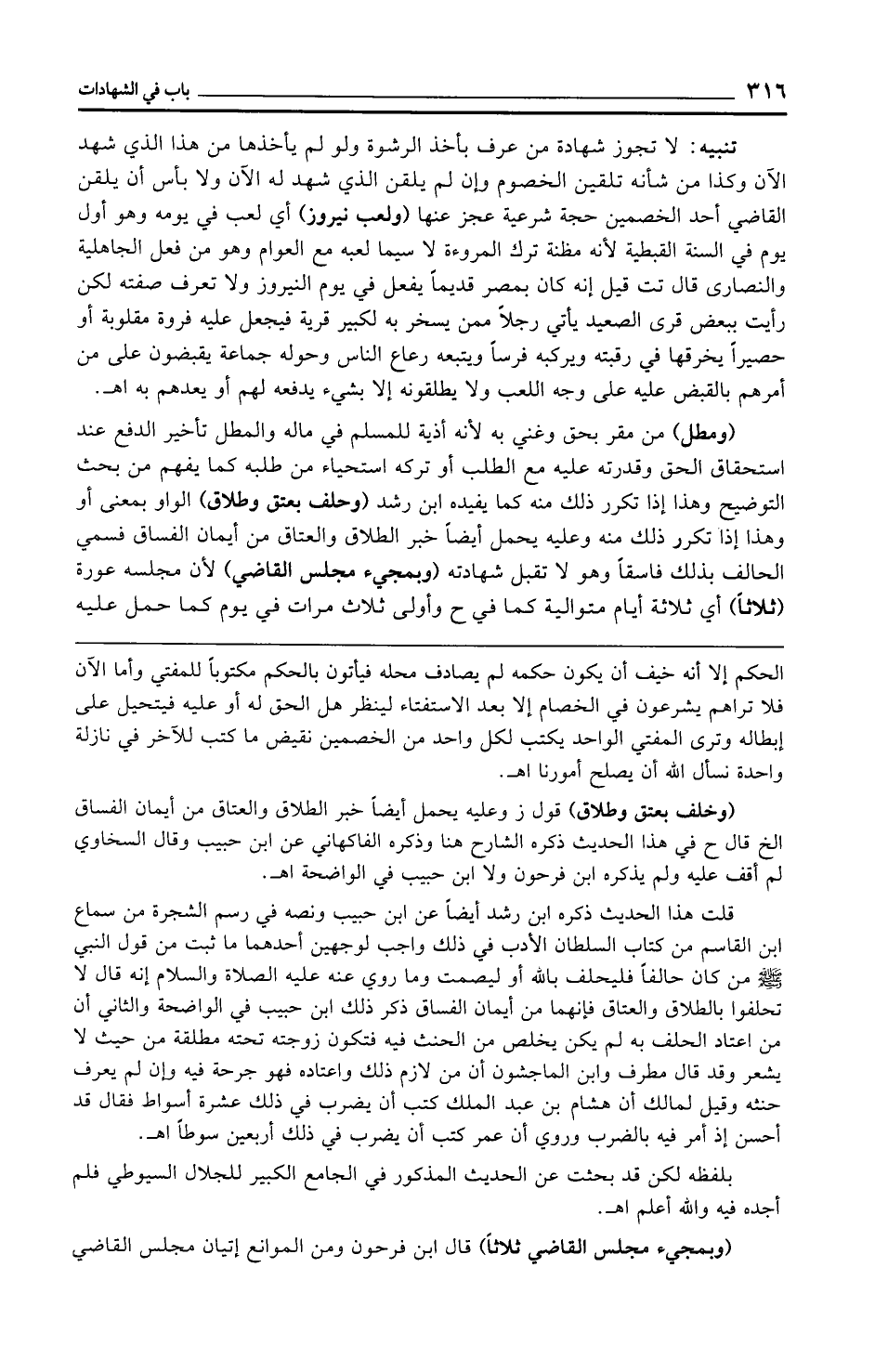 تنبيه: لا تجوز شهادة من عرف بأخذ الرشوة ولو لم يأخذها من هذا الذي شهد الآن وكذا من شأنه تلقين الخصوم وإن لم يلقن الذي شهد له الآن ولا بأس أن يلقن القاضي أحد الخصمين حجة شرعية عجز عنها (ولعب نيروز) أي لعب في يومه وهو أول يوم في السنة القبطية لأنه مظنة ترك المروءة لا سيما لعبه مع العوام وهو من فعل الجاهلية والنصارى قال تت قيل إنه كان بمصر قديمًا يفعل في يوم النيروز ولا تعرف صفته لكن رأيت ببعض قرى الصعيد يأتي رجلًا ممن يسخر به لكبير قرية فيجعل عليه فروة مقلوبة أو حصيرًا يخرقها في رقبته ويركبه فرسًا ويتبعه رعاع الناس وحوله جماعة يقبضون على من أمرهم بالقبض عليه على وجه اللعب ولا يطلقونه إلا بشيء يدفعه لهم أو يعدهم به اهـ.