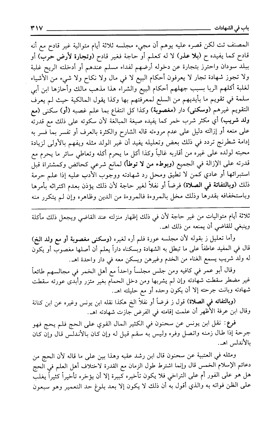 المصنف تت لكن قصره عليه يوهم أن مجيء مجلسه ثلاثة أيام متوالية غير قادح مع أنه قادح كما يفيده ح (بلا عذر) لا له كعلم أو حاجة فغير قادح (وتجارة لأرض حرب) أو ببلد سودان واحترز بتجارة عن دخوله أرضهم لفداء مسلم عندهم أو أدخلته الريح غلبة ولا تجوز شهادة تجار لا يعرفون أحكام البيع لا في مال ولا نكاح ولا شيء من الأشياء لغلبة أكلهم الربا بسبب جهلهم أحكام البيع والشراء هذا مذهب مالك وأحازها ابن أبي سلمة في تقويم ما بأيديهم من السلع لمعرفتهم بها وكذا يقول المالكية حيث لم يعرف التقويم غيرهم (وسكنى) دار (مغصوبة) وكذا كل انتفاع بما علم غصبه (أو) سكنى (مع ولد شريب) أي مكثر شرب خمر كما يفيده صيغة المبالغة لأن سكوته على ذلك مع قدرته على منعه أو إزالته دليل على عدم مروءته قاله الشارح والكثرة بالعرف أو تفسر بما فسر به إدامة شطرنج تردد في ذلك بعض وتعليله يفيد أن غير الولد مثله ويفهم بالأولى لزيادة محبته لولده على غيره من أقاربه غالبًا وكذا أكل ما يحرم أكله وتعاطي سائر ما يحرم مع قدرته على الإزالة في الجميع (وبوطء من لا توطأ) لمانع شرعي كحائض وكمشتراة قبل استبرائها أو عادي كمن لا تطيق ومحل رد شهادته ووجوب الأدب عليه إذا علم حرمة ذلك (وبالتفاتة في الصلاة) فرضًا أو نفلًا لغير حاجة لأن ذلك يؤذن بعدم اكتراثه بأمرها وباستخفافه بقدرها وذلك مخل بالمروءة فالمروءة من الدين وظاهره وإن لم يتكرر منه