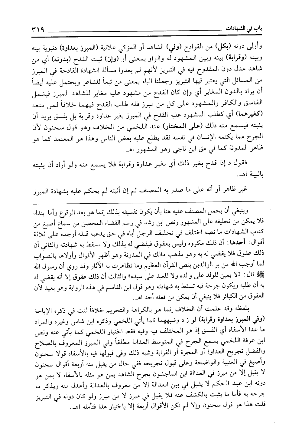 بلفظه وقد علمت أن الخلاف إنما هو بالكراهة والتحريم خلافًا لتت في ذكره الإباحة (وفي المبرز بعداوة وقرابة) لو زاد وشبههما كما يأتي اللخمي وذكره ابن شاس وغيره والمراد ما عدا الأسفاه أي الفسق إذ هو المختلف فيه وفيه فقط اختيار اللخمي كما يأتي عنه ونص ابن عرفة اللخمي يسمع الجرح في المتوسط العدالة مطلقًا وفي المبرز المعروف بالصلاح والفضل تجريح العداوة أو المغيرة أو القرابة وشبه ذلك وفي قبولها فيه بالأسفاه قولا سحنون وأصبغ في العتبية والواضحة وعلى قبول تجريحه ففي حال من يقبل منه أربعة أقوال سحنون لا يقبل إلا من مبرز في العدالة ابن الماجشون يجرح الشاهد بمن هو مثله بالأسفاه لا بمن هو دونه ابن عبد الحكم لا يقبل في بين العدالة إلا من معروف بالعدالة وأعدل منه ويذكر ما جرحه به فأما ما يثبت بالكشف عنه فلا يقبل في مبرز لا من مبرز ولو كان دونه في التبريز قلت هذا هو قول سحنون وإلا لم تكن الأقوال أربعة إلا باختيار هذا فتأمله اهـ.