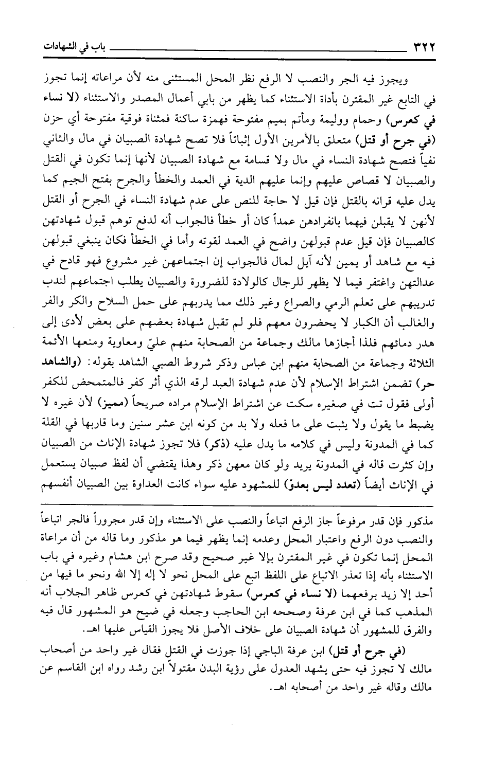 ويجوز فيه الجر والنصب لا الرفع نظر المحل المستثنى منه لأن مراعاته إنما تجوز في التابع غير المقترن بأداة الاستثناء كما يظهر من بابي أعمال المصدر والاستثناء (لا نساء في كعرس) وحمام ووليمة ومأتم بميم مفتوحة فهمزة ساكنة فمثناة فوقية مفتوحة أي حزن (في جرح أو قتل) متعلق بالأمرين الأول إثباتًا فلا تصح شهادة الصبيان في مال والثاني نفيًا فتصح شهادة النساء في مال ولا قسامة مع شهادة الصبيان لأنها إنما تكون في القتل والصبيان لا قصاص عليهم وإنما عليهم الدية في العمد والخطأ والجرح بفتح الجيم كما يدل عليه قرانه بالقتل فإن قيل لا حاجة للنص على عدم شهادة النساء في الجرح أو القتل لأنهن لا يقبلن فيهما بانفرادهن عمدًا كان أو خطأ فالجواب أنه لدفع توهم قبول شهادتهن كالصبيان فإن قيل عدم قبولهن واضح في العمد لقوته وأما في الخطأ فكان ينبغي قبولهن فيه مع شاهد أو يمين لأنه آيل لمال فالجواب إن اجتماعهن غير مشروع فهو قادح في عدالتهن واغتفر فيما لا يظهر للرجال كالولادة للضرورة والصبيان يطلب اجتماعهم لندب تدريبهم على تعلم الرمي والصراع وغير ذلك مما يدربهم على حمل السلاح والكر والفر والغالب أن الكبار لا يحضرون معهم فلو لم تقبل شهادة بعضهم على بعض لأدى إلى هدر دمائهم فلذا أجازها مالك وجماعة من الصحابة منهم علي ومعاوية ومنعها الأئمة الثلاثة وجماعة من الصحابة منهم ابن عباس وذكر شروط الصبي الشاهد بقوله: (والشاهد حر) تضمن اشتراط الإسلام لأن عدم شهادة العبد لرقه الذي أثر كفر فالمتمحض للكفر أولى فقول تت في صغيره سكت عن اشتراط الإسلام مراده صريحًا (مميز) لأن غيره لا يضبط ما يقول ولا يثبت على ما فعله ولا بد من كونه ابن عشر سنين وما قاربها في القلة كما في المدونة وليس في كلامه ما يدل عليه (ذكر) فلا تجوز شهادة الإناث من الصبيان وإن كثرت قاله في المدونة يريد ولو كان معهن ذكر وهذا يقتضي أن لفظ صبيان يستعمل في الإناث أيضًا (تعدد ليس بعدوّ) للمشهود عليه سواء كانت العداوة بين الصبيان أنفسهم