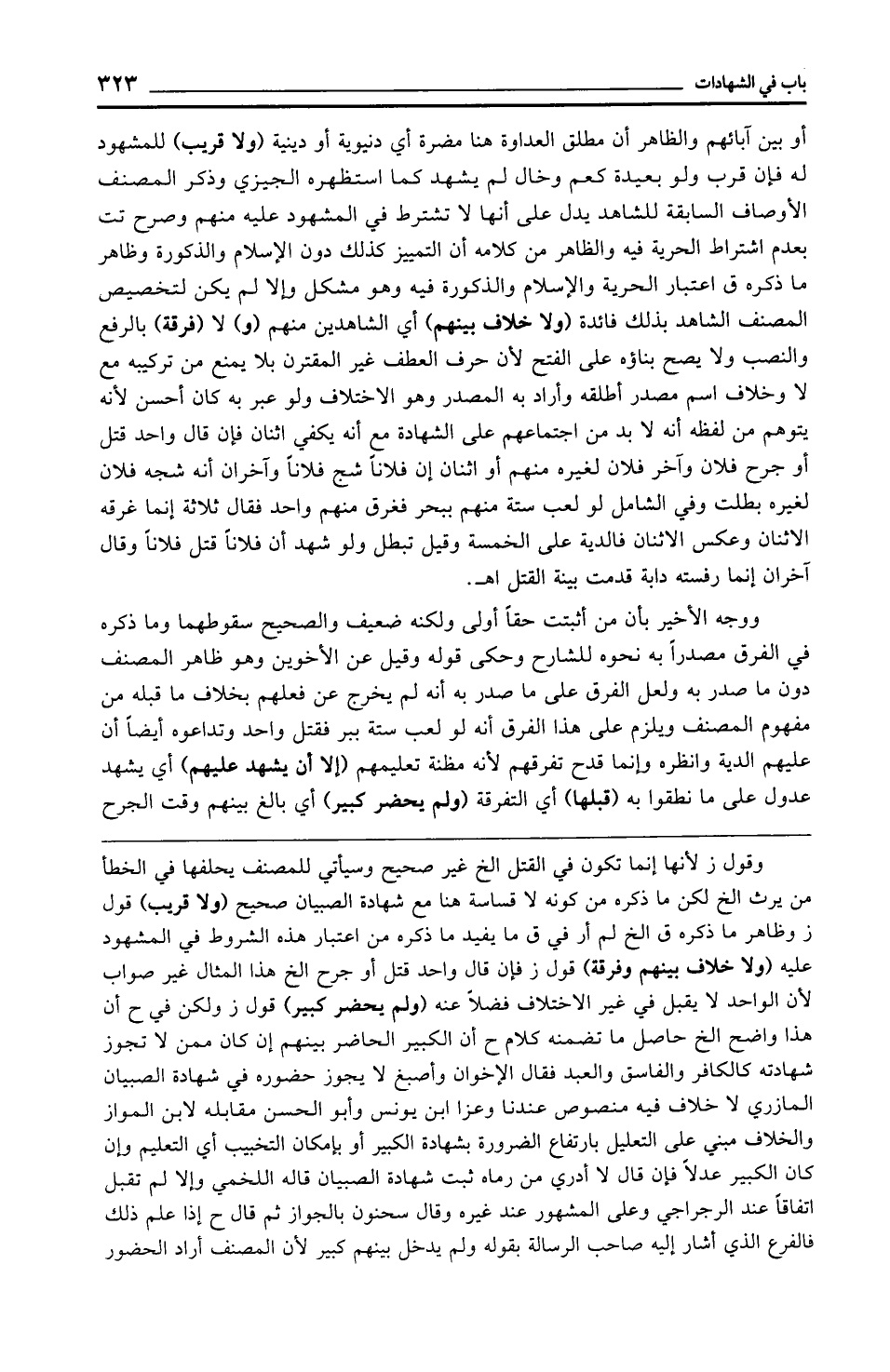 أو بين آبائهم والظاهر أن مطلق العداوة هنا مضرة أي دنيوية أو دينية (ولا قريب) للمشهود له فإن قرب ولو بعيدة كعم وخال لم يشهد كما استظهره الجيزي وذكر المصنف الأوصاف السابقة للشاهد يدل على أنها لا تشترط في المشهود عليه منهم وصرح تت بعدم اشتراط الحرية فيه والظاهر من كلامه أن التمييز كذلك دون الإسلام والذكورة وظاهر ما ذكره ق اعتبار الحرية والإسلام والذكورة فيه وهو مشكل وإلا لم يكن لتخصيص المصنف الشاهد بذلك فائدة (ولا خلاف بينهم) أي الشاهدين منهم (و) لا (فرقة) بالرفع والنصب ولا يصح بناؤه على الفتح لأن حرف العطف غير المقترن بلا يمنع من تركيبه مع لا وخلاف اسم مصدر أطلقه وأراد به المصدر وهو الاختلاف ولو عبر به كان أحسن لأنه يتوهم من لفظه أنه لا بد من اجتماعهم على الشهادة مع أنه يكفي اثنان فإن قال واحد قتل أو جرح فلان وآخر فلان لغيره منهم أو اثنان إن فلانًا شج فلانًا وآخران أنه شجه فلان لغيره بطلت وفي الشامل لو لعب ستة منهم ببحر فغرق منهم واحد فقال ثلاثة إنما غرقه الاثنان وعكس الاثنان فالدية على الخمسة وقيل تبطل ولو شهد أن فلانًا قتل فلانًا وقال آخران إنما رفسته دابة قدمت بينة القتل اهـ.