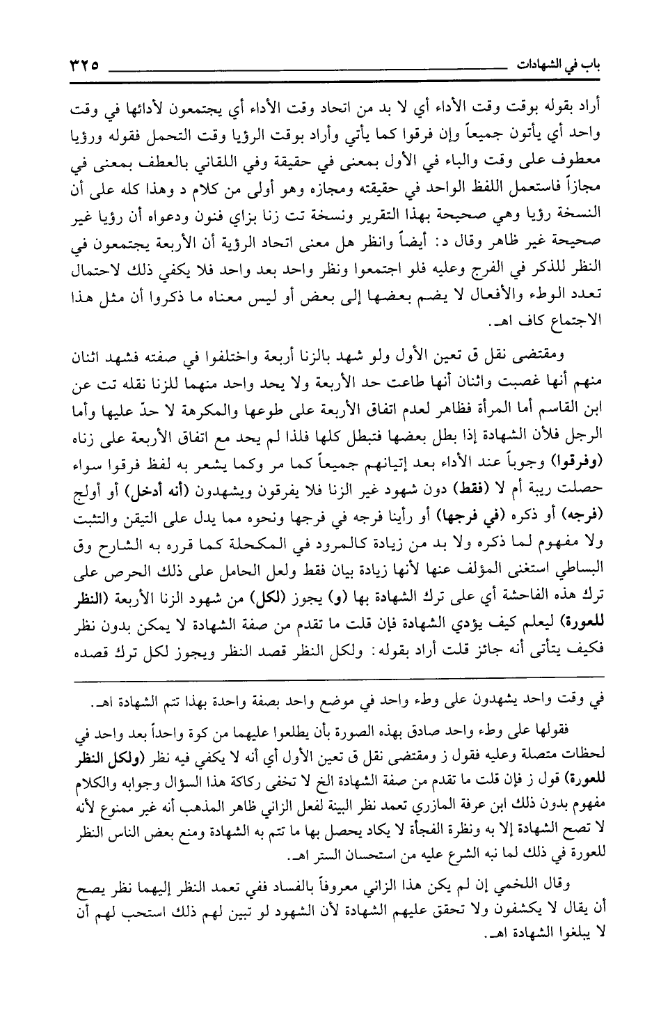 أراد بقوله بوقت وقت الأداء أي لا بد من اتحاد وقت الأداء أي يجتمعون لأدائها في وقت واحد أي يأتون جميعًا وإن فرقوا كما يأتي وأراد بوقت الرؤيا وقت التحمل فقوله ورؤيا معطوف على وقت والباء في الأول بمعنى في حقيقة وفي اللقاني بالعطف بمعنى في مجازًا فاستعمل اللفظ الواحد في حقيقته ومجازه وهو أولى من كلام د وهذا كله على أن النسخة رؤيا وهي صحيحة بهذا التقرير ونسخة تت زنا بزاي فنون ودعواه أن رؤيا غير صحيحة غير ظاهر وقال د: أيضًا وانظر هل معنى اتحاد الرؤية أن الأربعة يجتمعون في النظر للذكر في الفرج وعليه فلو اجتمعوا ونظر واحد بعد واحد فلا يكفي ذلك لاحتمال تعدد الوطء والأفعال لا يضم بعضها إلى بعض أو ليس معناه ما ذكروا أن مثل هذا الاجتماع كاف اهـ.