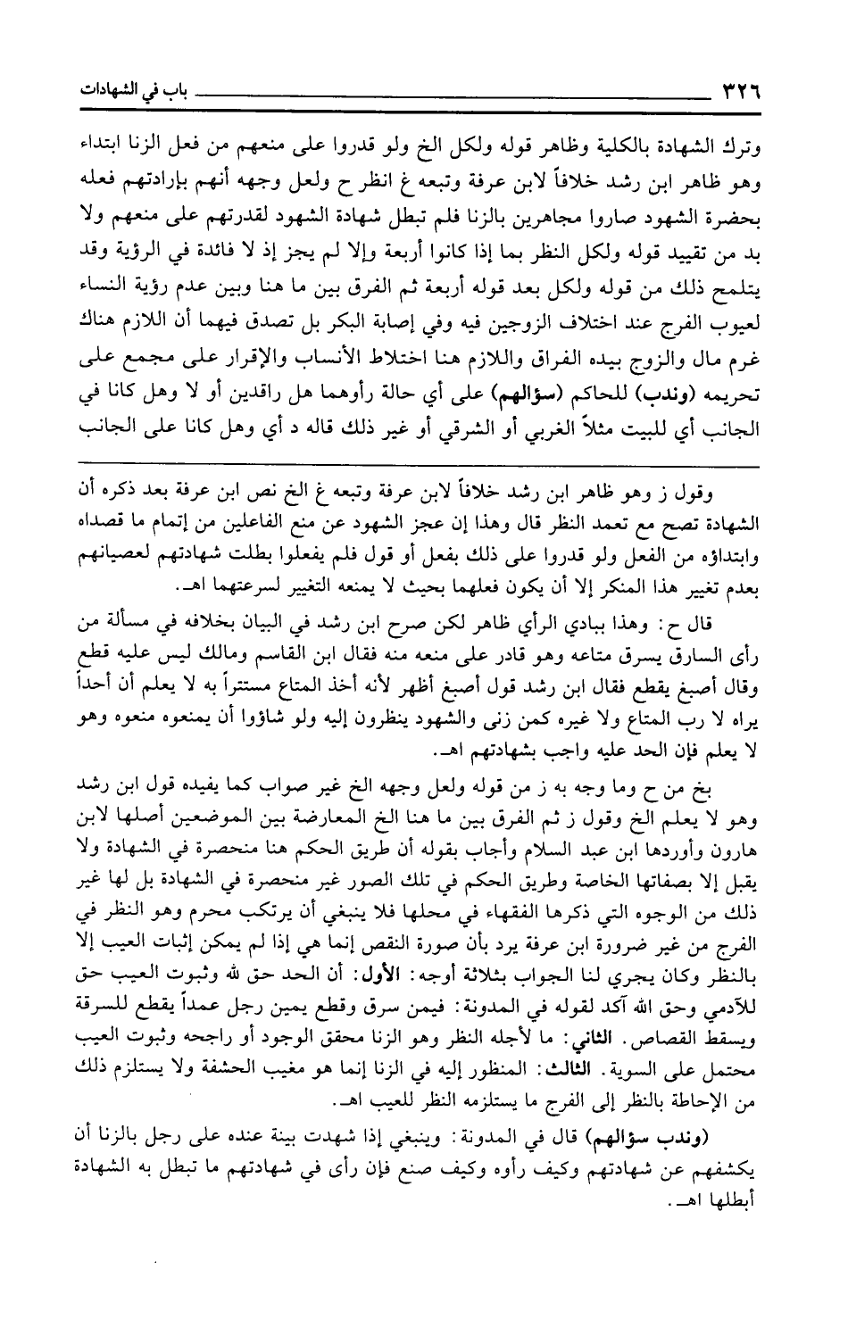 وترك الشهادة بالكلية وظاهر قوله ولكل الخ ولو قدروا على منعهم من فعل الزنا ابتداء وهو ظاهر ابن رشد خلافًا لابن عرفة وتبعه غ انظر ح ولعل وجهه أنهم بإرادتهم فعله بحضرة الشهود صاروا مجاهرين بالزنا فلم تبطل شهادة الشهود لقدرتهم على منعهم ولا بد من تقييد قوله ولكل النظر بما إذا كانوا أربعة وإلا لم يجز إذ لا فائدة في الرؤية وقد يتلمح ذلك من قوله ولكل بعد قوله أربعة ثم الفرق بين ما هنا وبين عدم رؤية النساء لعيوب الفرج عند اختلاف الزوجين فيه وفي إصابة البكر بل تصدق فيهما أن اللازم هناك غرم مال والزوج بيده الفراق واللازم هنا اختلاط الأنساب والإقرار على مجمع على تحريمه (وندب) للحاكم (سؤالهم) على أي حالة رأوهما هل راقدين أو لا وهل كانا في الجانب أي للبيت مثلًا الغربي أو الشرقي أو غير ذلك قاله د أي وهل كانا على الجانب