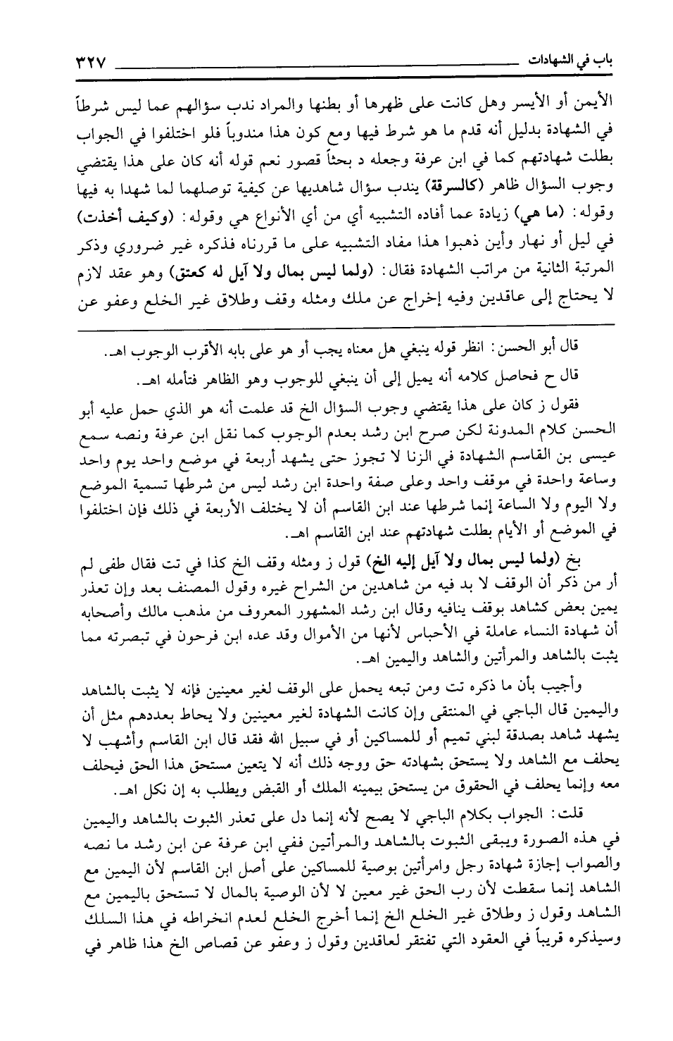 بخ (ولما ليس بمال ولا آيل إليه الخ) قول ز ومثله وقف الخ كذا في تت فقال طفى لم أر من ذكر أن الوقف لا بد فيه من شاهدين من الشراح غيره وقول المصنف بعد وإن تعذر يمين بعض كشاهد بوقف ينافيه وقال ابن رشد المشهور المعروف من مذهب مالك وأصحابه أن شهادة النساء عاملة في الأحباس لأنها من الأموال وقد عده ابن فرحون في تبصرته مما يثبت بالشاهد والمرأتين والشاهد واليمين اهـ.