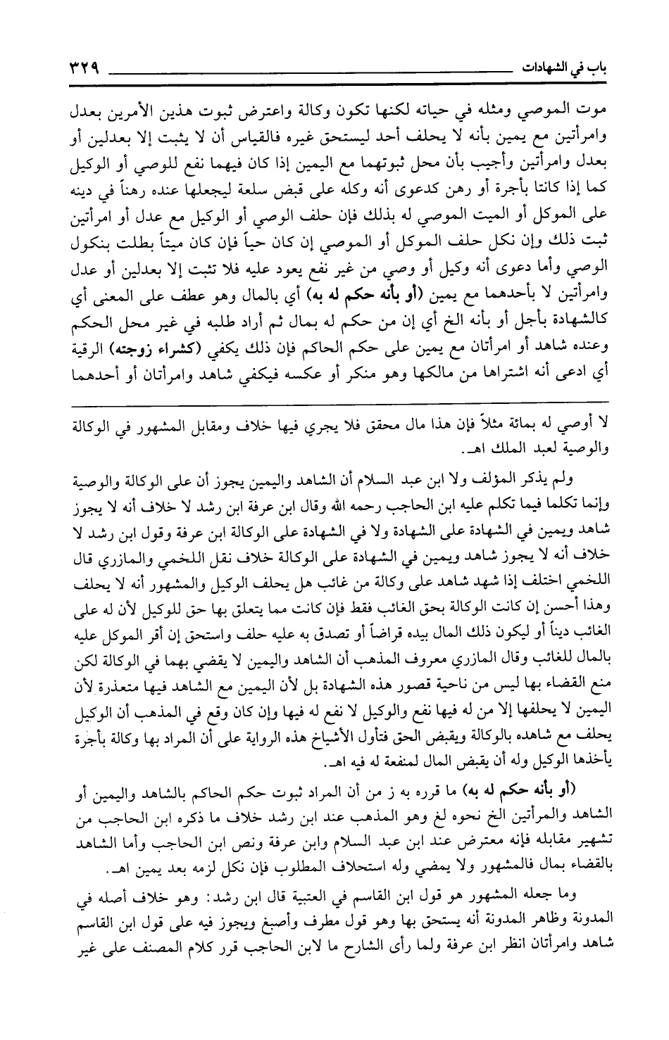 ولم يذكر المؤلف ولا ابن عبد السلام أن الشاهد واليمين يجوز أن على الوكالة والوصية وإنما تكلما فيما تكلم عليه ابن الحاجب رحمه الله وقال ابن عرفة ابن رشد لا خلاف أنه لا يجوز شاهد ويمين في الشهادة على الشهادة ولا في الشهادة على الوكالة ابن عرفة وقول ابن رشد لا خلاف أنه لا يجوز شاهد ويمين في الشهادة على الوكالة خلاف نقل اللخمي والمازري قال اللخمي اختلف إذا شهد شاهد على وكالة من غائب هل يحلف الوكيل والمشهور أنه لا يحلف وهذا أحسن إن كانت الوكالة بحق الغائب فقط فإن كانت مما يتعلق بها حق للوكيل لأن له على الغائب دينًا أو ليكون ذلك المال بيده قراضًا أو تصدق به عليه حلف واستحق إن أقر الموكل عليه بالمال للغائب وقال المازري معروف المذهب أن الشاهد واليمين لا يقضي بهما في الوكالة لكن منع القضاء بها ليس من ناحية قصور هذه الشهادة بل لأن اليمين مع الشاهد فيها متعذرة لأن اليمين لا يحلفها إلا من له فيها نفع والوكيل لا نفع له فيها وإن كان وقع في المذهب أن الوكيل يحلف مع شاهده بالوكالة ويقبض الحق فتأول الأشياخ هذه الرواية على أن المراد بها وكالة بأجرة يأخذها الوكيل وله أن يقبض المال لمنفعة له فيه اهـ.