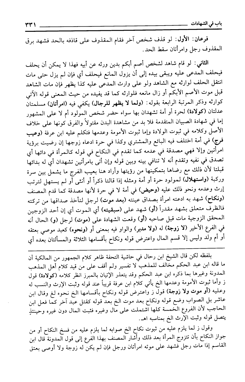 بلفظه لكن قال الشيخ ابن رحال في حاشية التحفة ظاهر كلام الجمهور من المالكية أن ما قاله ابن عبد الحكم مخالف للمذهب لا تفسير ولم أقف على من قيد كلام أهل المذهب المدونة وغيرها بما ذكره ابن عبد الحكم وقد يتعذر الإتيان بالمبرز انظر كلامه (كولادة) قول ز وأما ثبوت الأمومة وعدمها الخ يأتي كلام ابن عرفة قريبًا عند قوله وثبت الإرث والنسب له وعليه (أو موت ولا زوجة) قول ز واعترض قوله ونكاح بأقسامها الخ نحوه لغ وقال ابن عاشر بل الصواب وضع قوله ونكاح بعد موت الخ بعد قوله كقتل عبد آخر كما فعل ابن الحاجب لأن الفروع الخمسة كلها اشتملت على مال وغيره فثبت المال دون غيره وحينئذٍ يتصل قوله وثبت الإرث الخ بمناسبه اهـ.